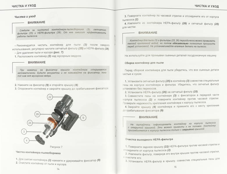 Контейнер для мусора производитель рекомендует очищать после каждой уборки. Необходимо также следить за чистотой фильтра тонкой очистки и выпускного фильтра. HEPA-элементы не рекомендуется подвергать воздействию влаги: им предписана только сухая чистка.