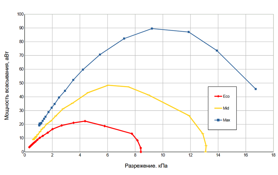 Мощность всасывания (что это такое и как ее измеряем, описано в отдельной статье) мы определяли при работе пылесоса без трубы и насадок, в обоих режимах. Зависимость мощности всасывания от создаваемого разрежения приведена на графике ниже: