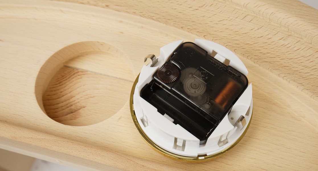 Часы удерживаются в деревянном основании двумя гибкими стальными защелками. Несложный электронный механизм питается от двух батареек типа ААА.