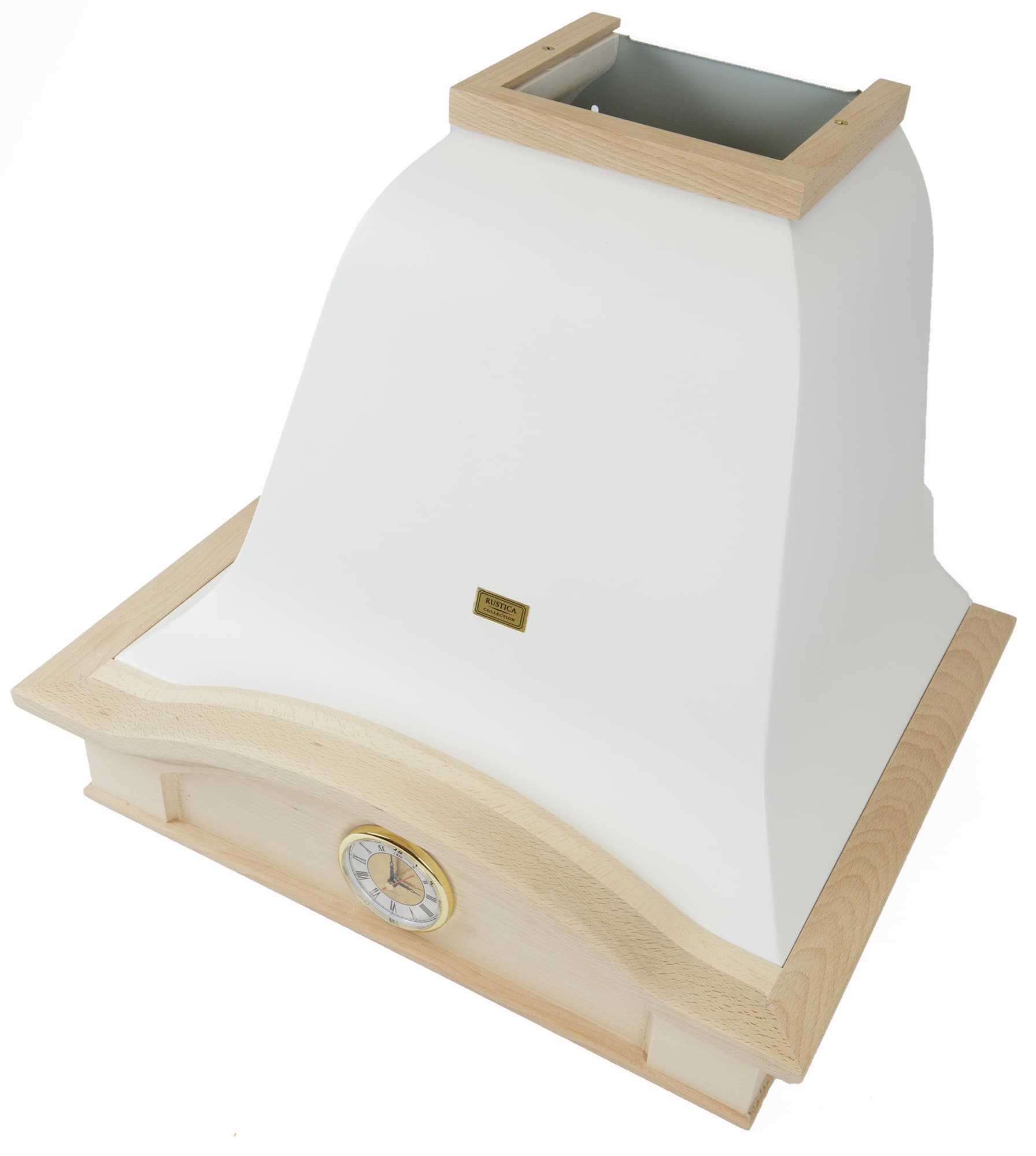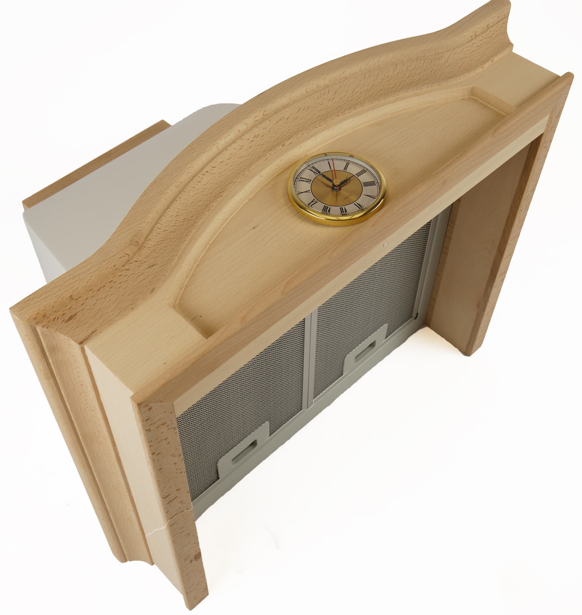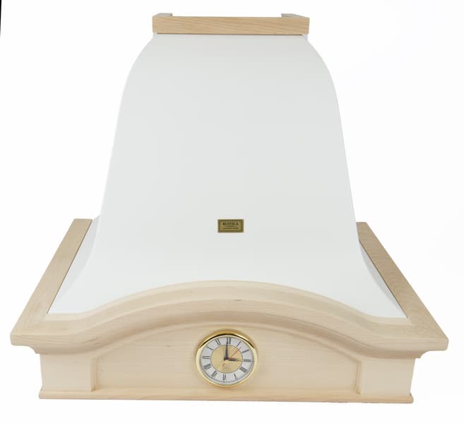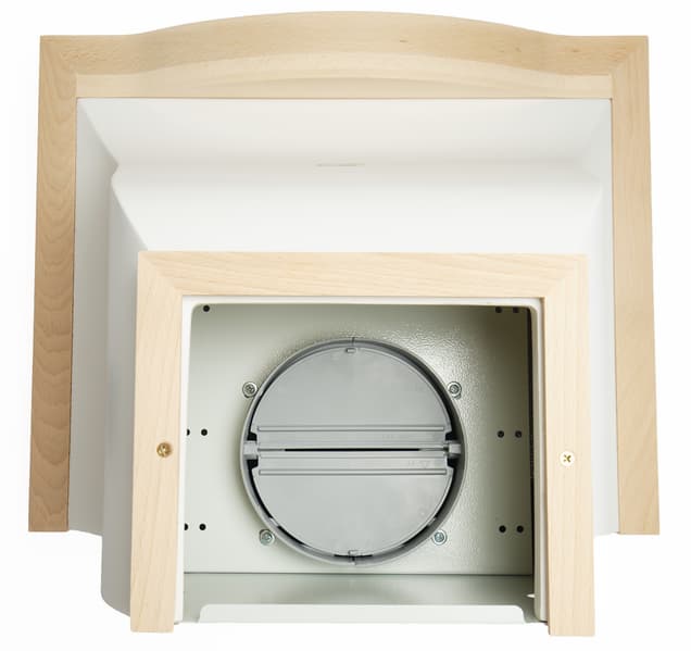 Благодаря нетонированным деревянным элементам вытяжка выглядит уютной и милой. Но у нас возникли сомнения в практичности использованного материала: опасаемся, что некрашеное дерево в условиях интенсивной эксплуатации над плитой быстро покроется трудновыводимыми загрязнениями от жира и кухонной копоти, а сложная геометрия декоративных рамок может затруднить уход за устройством.