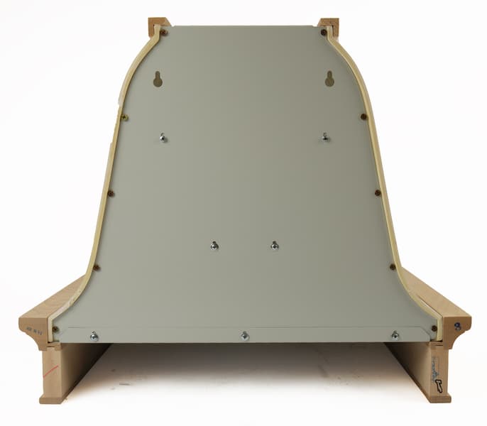 Задняя стенка вытяжки металлическая, в ее верхней части есть два отверстия для подвешивания.