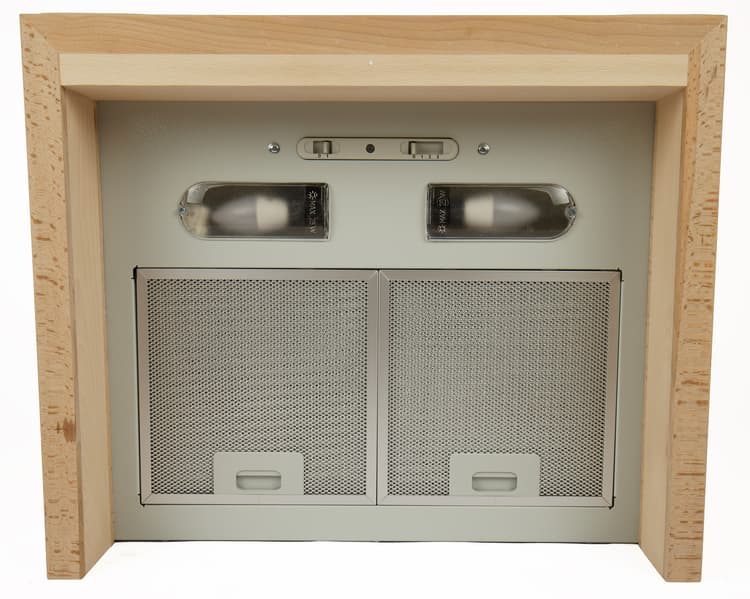 Управление вытяжкой механическое, простое и интуитивно понятное. Два переключателя, размещенные между плафонами светильников и передней кромкой декоративного обрамления, управляют освещением и мощностью вытяжного вентилятора.