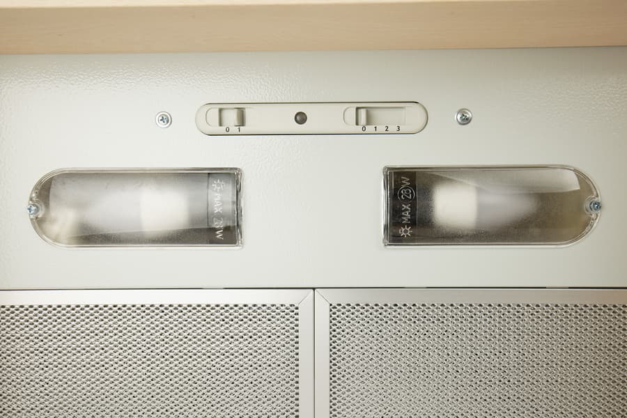 Двухпозиционный переключатель слева включает и выключает обе лампы. Правый, четырехпозиционный, регулирует мощность вытяжки — у этой модели три скорости.