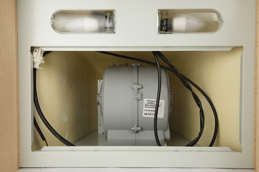 Под решетками антижировых фильтров расположен центробежный вентилятор в цилиндрическом корпусе. Если прибор не подключается к вытяжной вентиляции, а используется только для очистки воздуха, на торец корпуса монтируется угольный фильтр, задерживающий пыль и запахи (он не входит в комплект устройства, его надо купить отдельно).