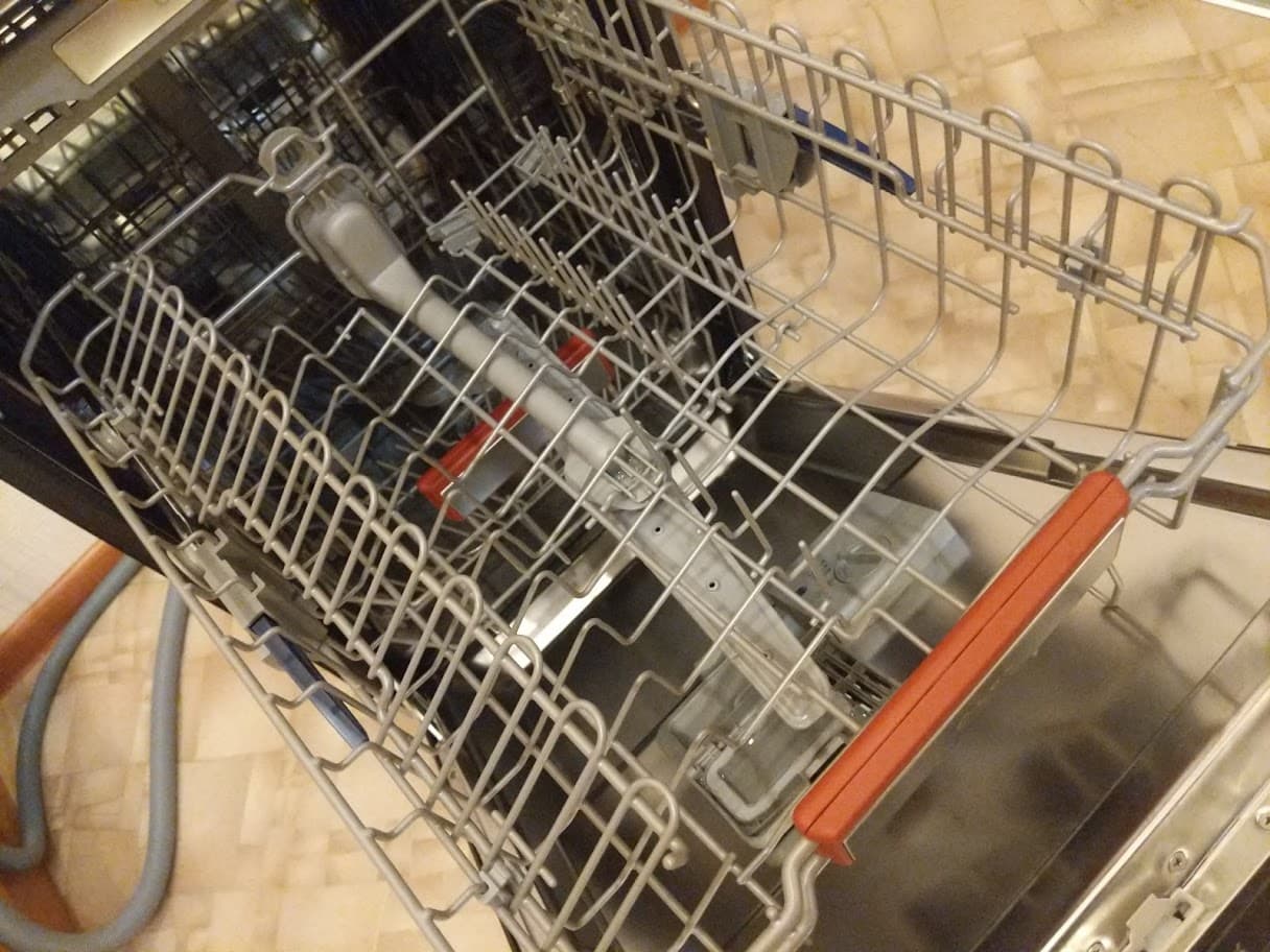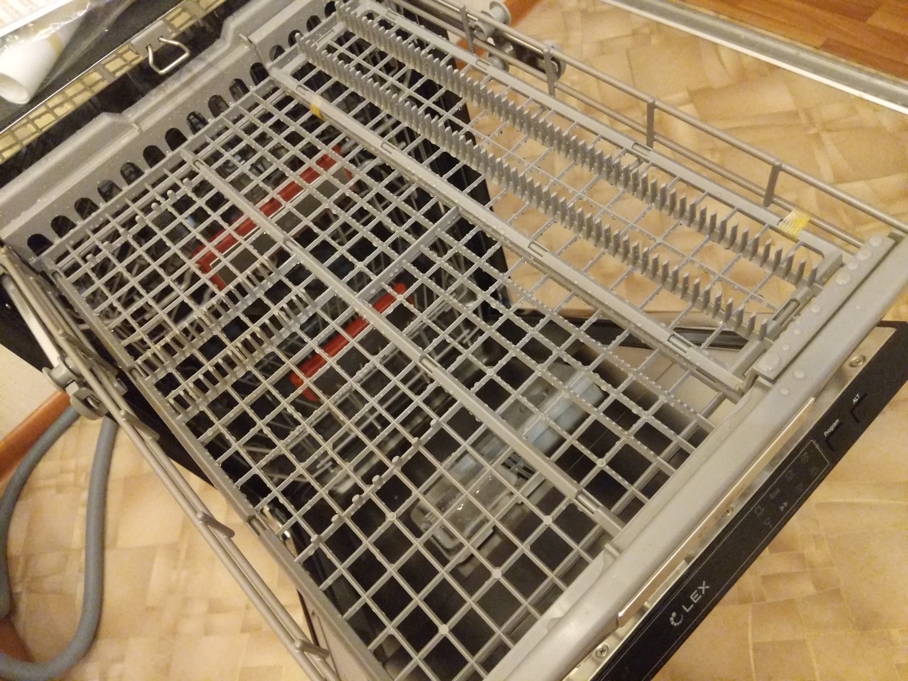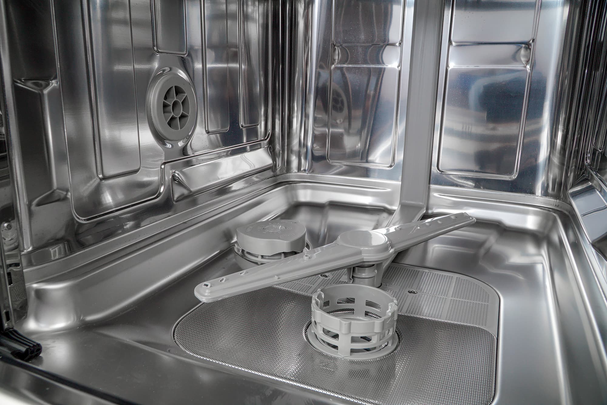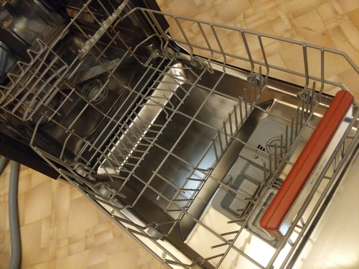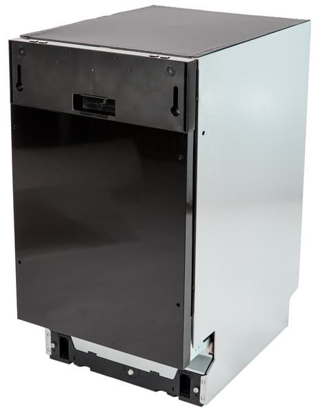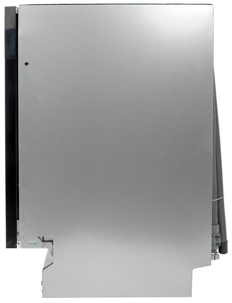 Мы отметили, что металл, из которого сделана дверца посудомойки, тонковат и позволяет ей слегка изгибаться под нагрузкой. Это было бы существенным минусом для отдельностоящей или частично встраиваемой ПММ, но для полновстраиваемой модели, у которой жесткость дверцы по умолчанию усилится с помощью декоративного фасада, это не является большой проблемой.