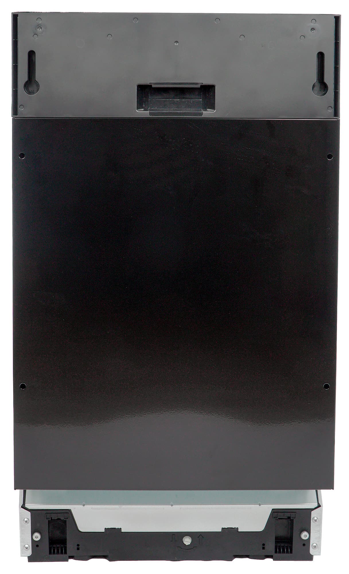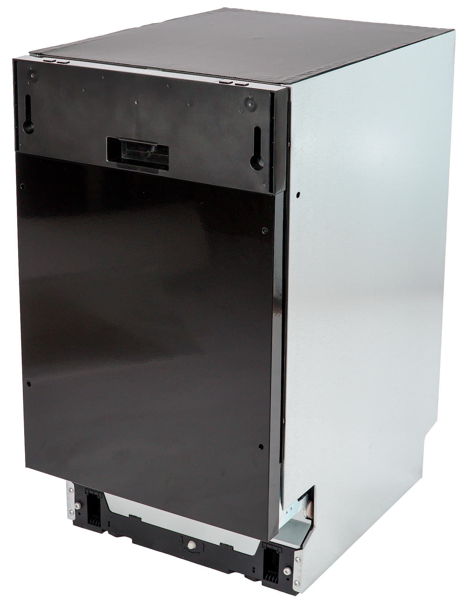Верхняя часть машины закрыта нетолстым слоем шумоизоляции. Лицевая сторона черного цвета, на ней есть отверстия для навески фасада и ручка-ниша, позволяющая открывать прибор и до встраивания.