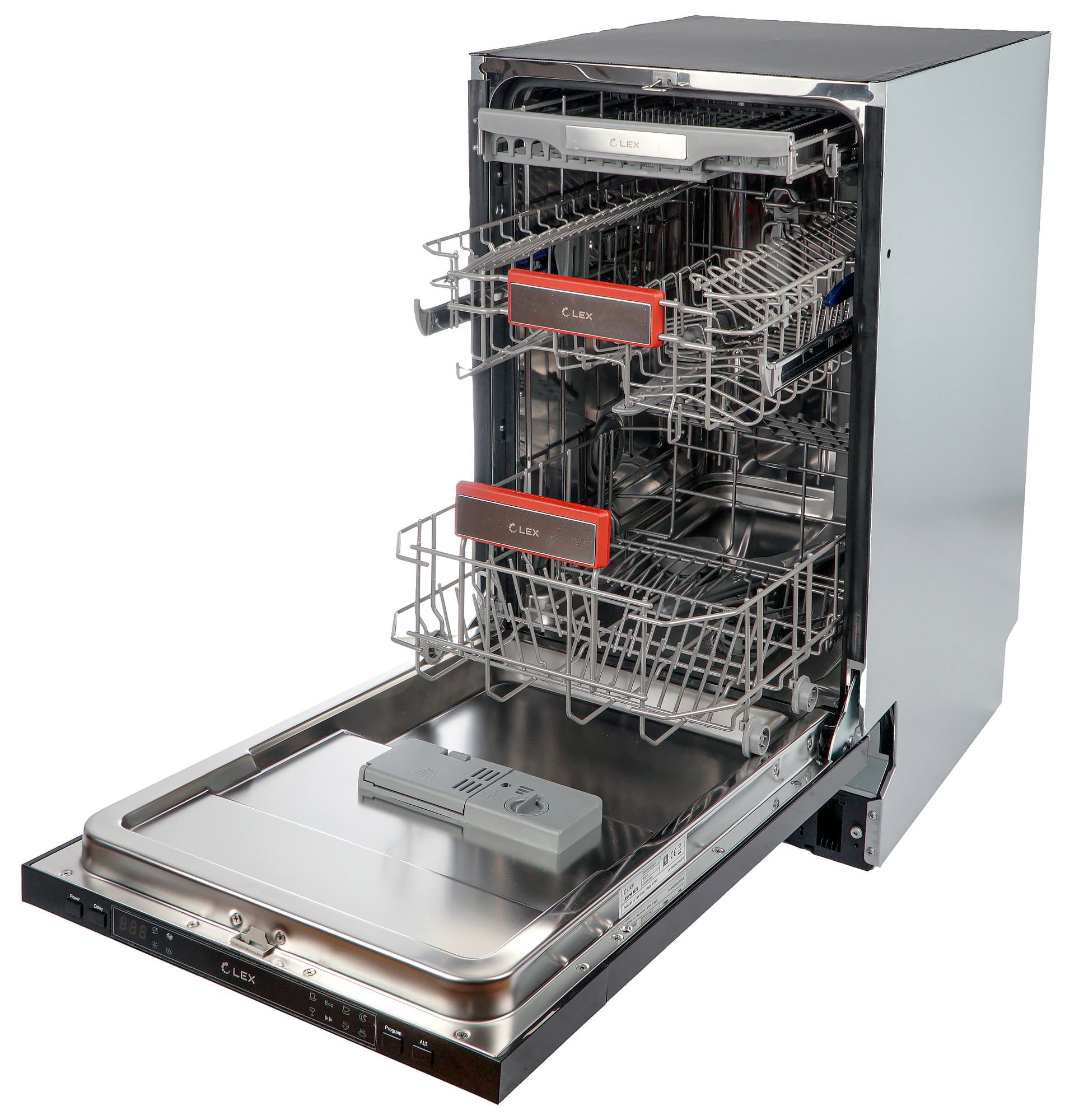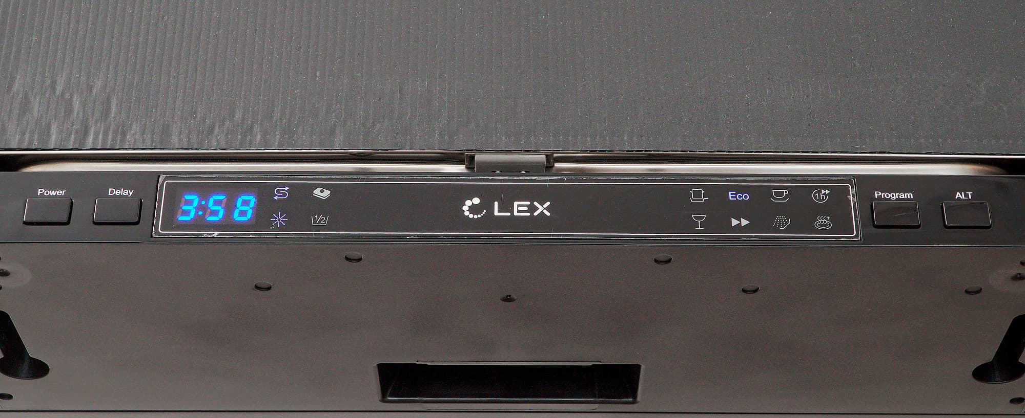 Как у всех полновстраиваемых посудомоек, органы управления у Lex PM 4573 сосредоточены на верхней кромке дверцы и после установки под столешницу доступны только на приоткрытой дверце.