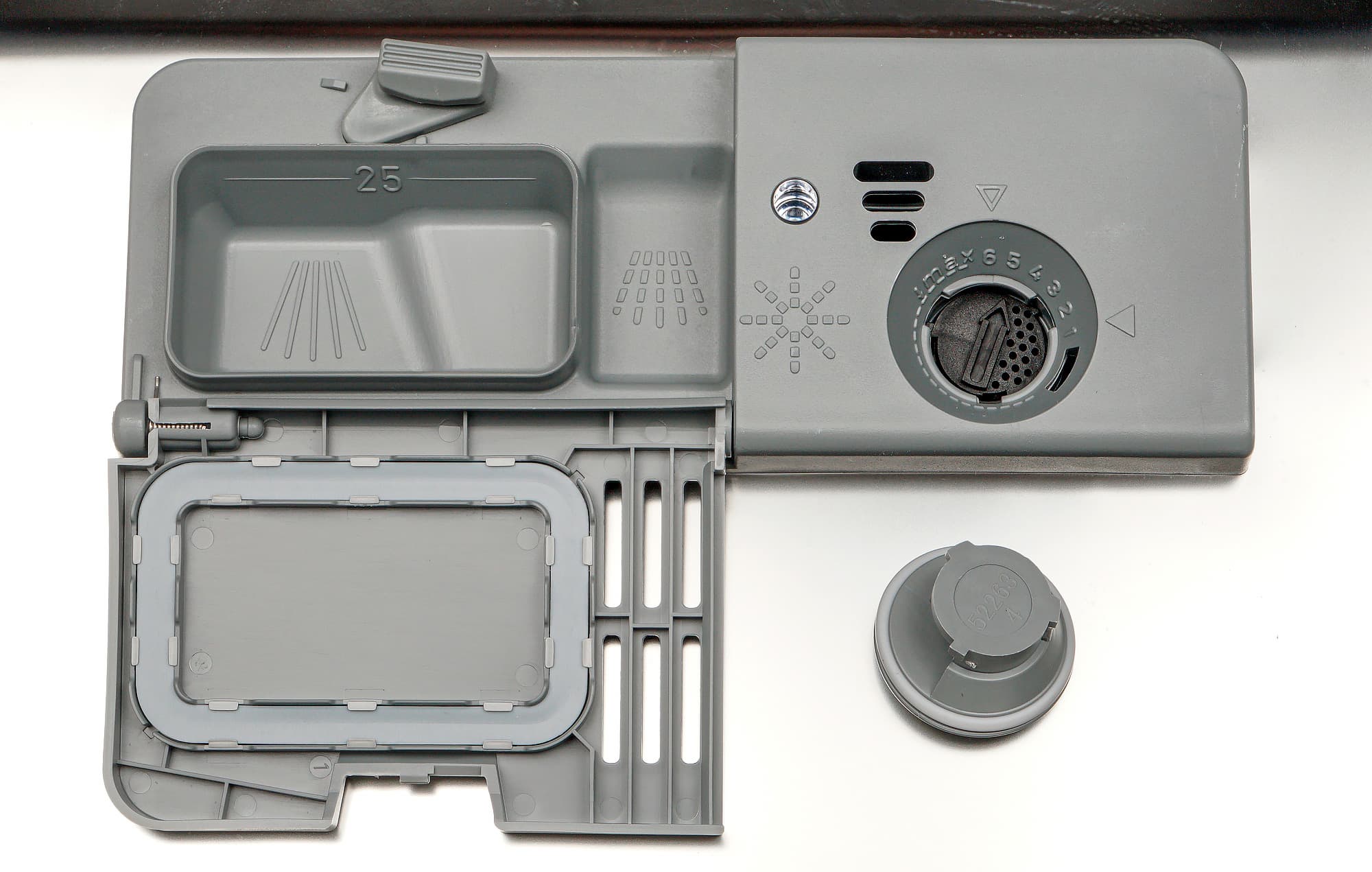 Контейнер для моющих средств и ополаскивателя имеет привычную конструкцию. В его левой части два отсека для МС — для основной и дополнительной мойки. В корзину для основной можно загружать как порошковые средства, так и таблетки «3 в 1», а емкость для предварительной предполагает загрузку только порошка. В правой части контейнера имеется отсек для ополаскивателя, закрытый пробкой и снабженный регулятором расхода.