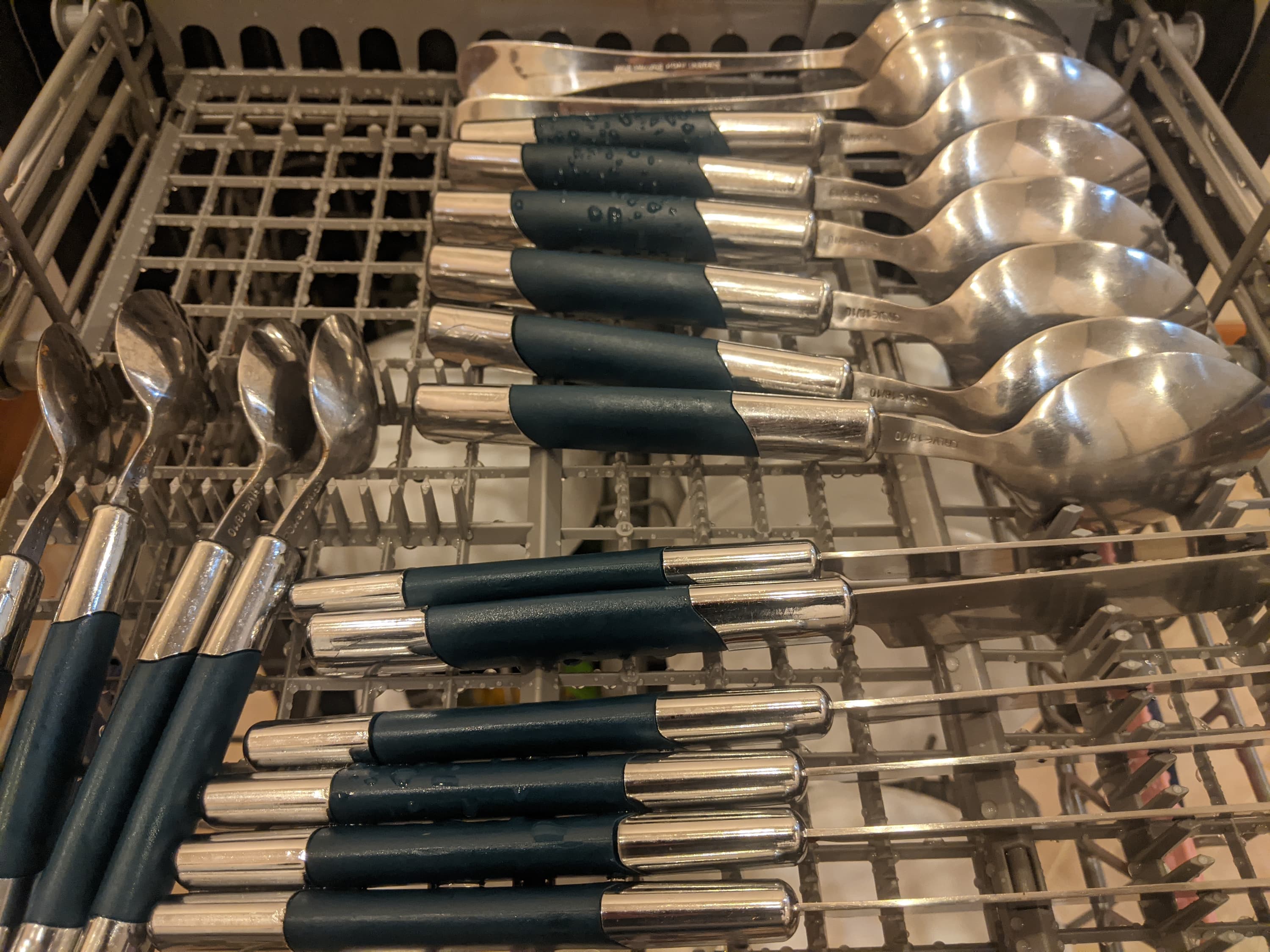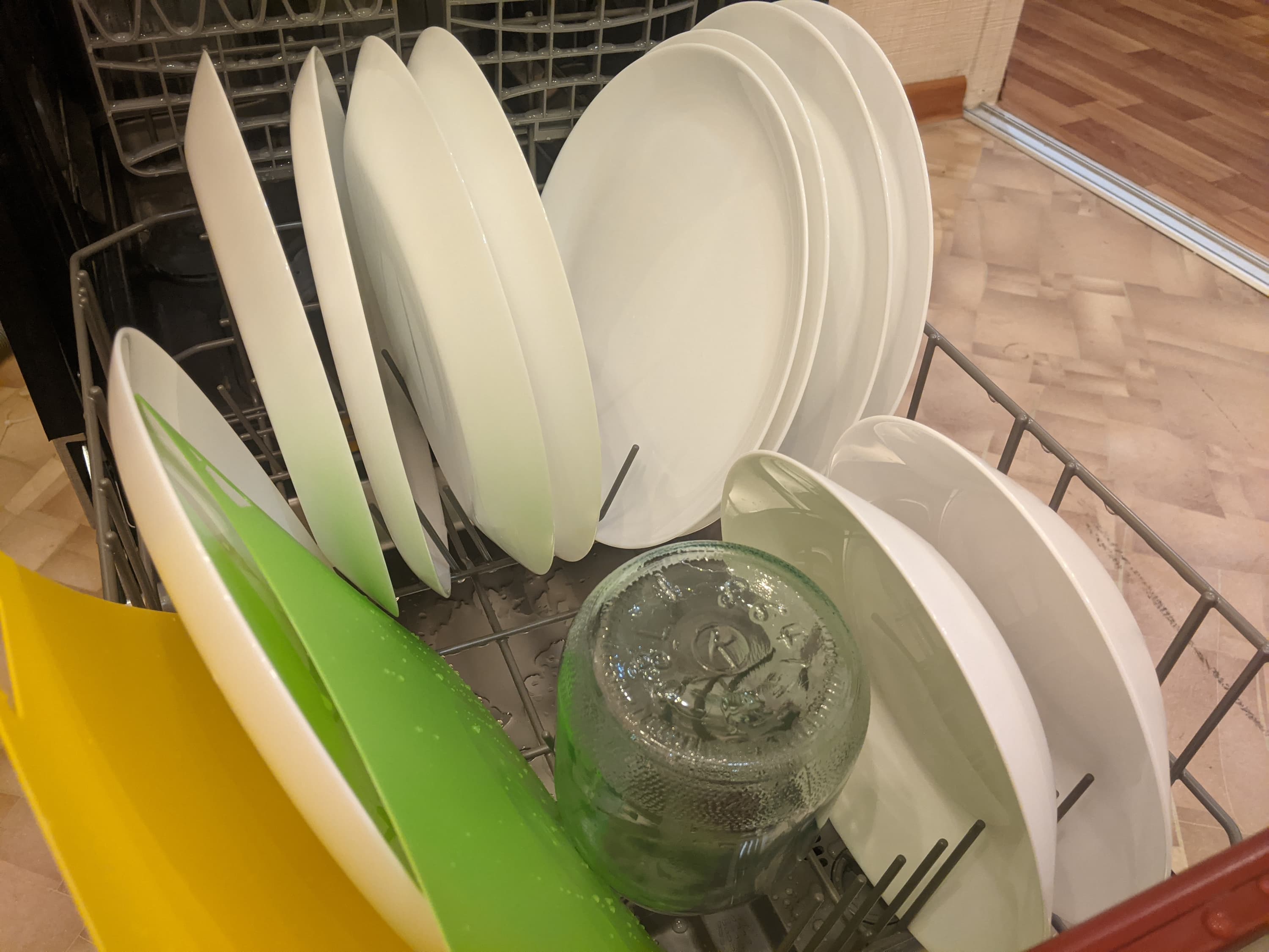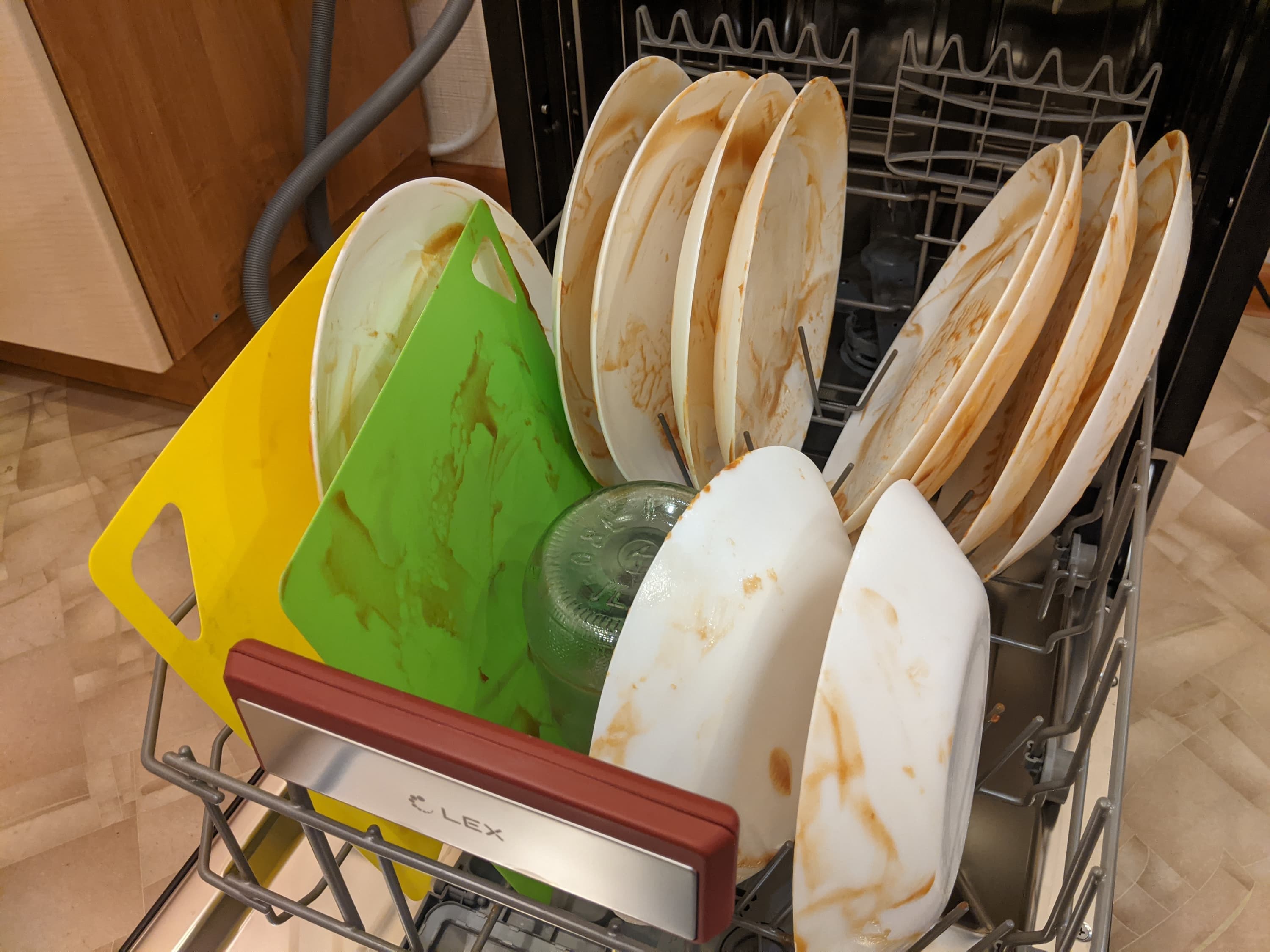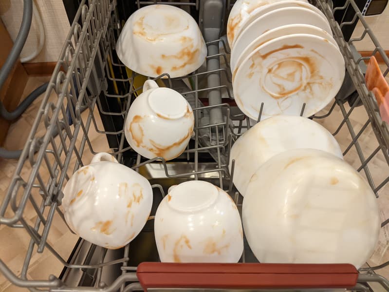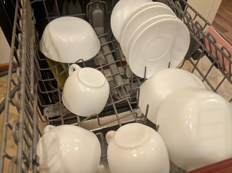 Испачканную посуду мы расставили на решетках равномерно, но умышленно неаккуратно и оставили в открытой посудомойке для высыхания в течение 24 часов.