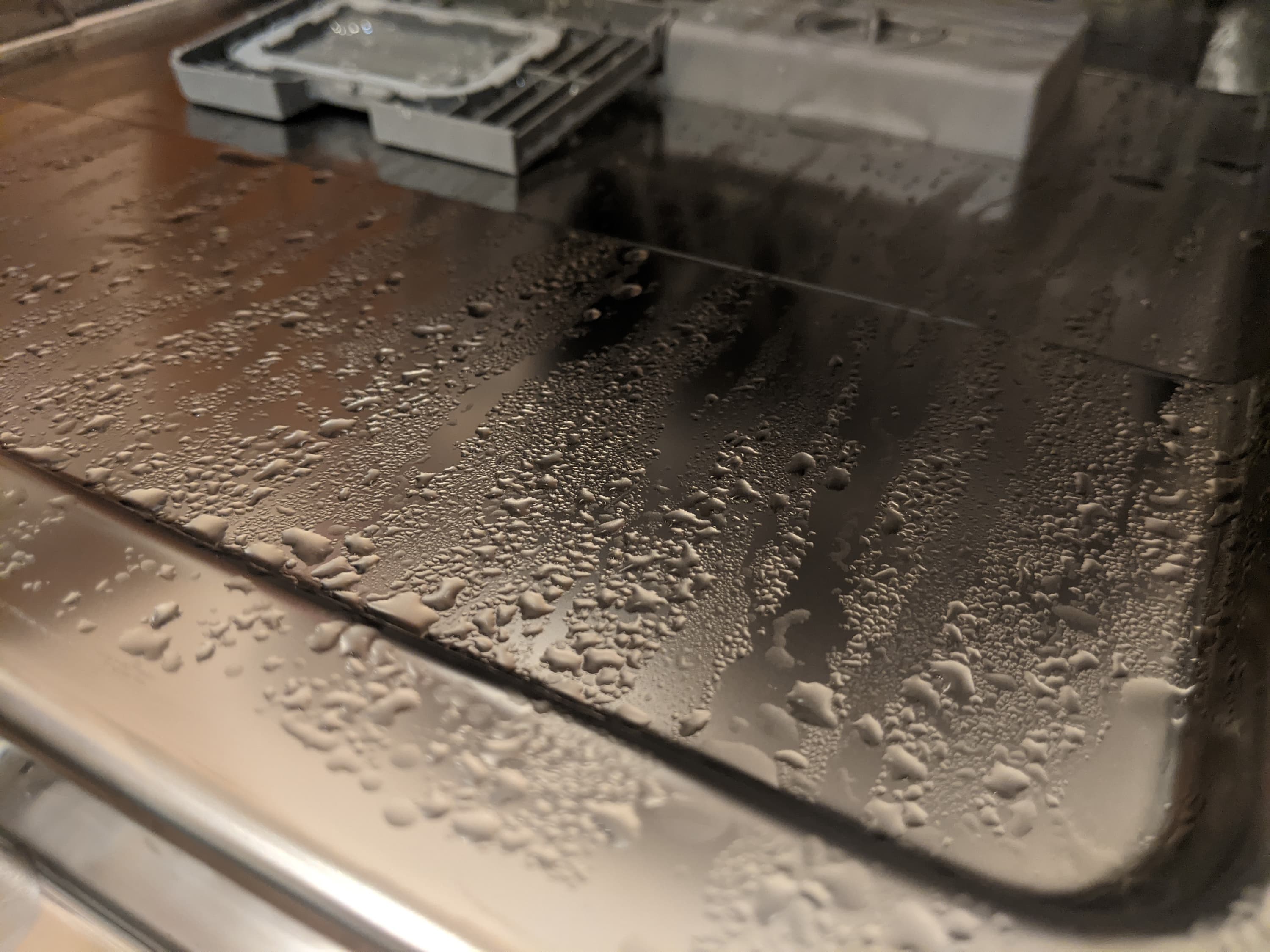 А вот между уплотнителем дверцы и корпусом осталось заметное количество грязи. Смешавшись со стекающим с дверцы конденсатом, кетчунез оставил неопрятные разводы на дне машины. Напомним, что в руководстве пользователя упомянуто, что в этом месте могут оставаться следы пищи, и рекомендуется следить за чистотой уплотнителя.