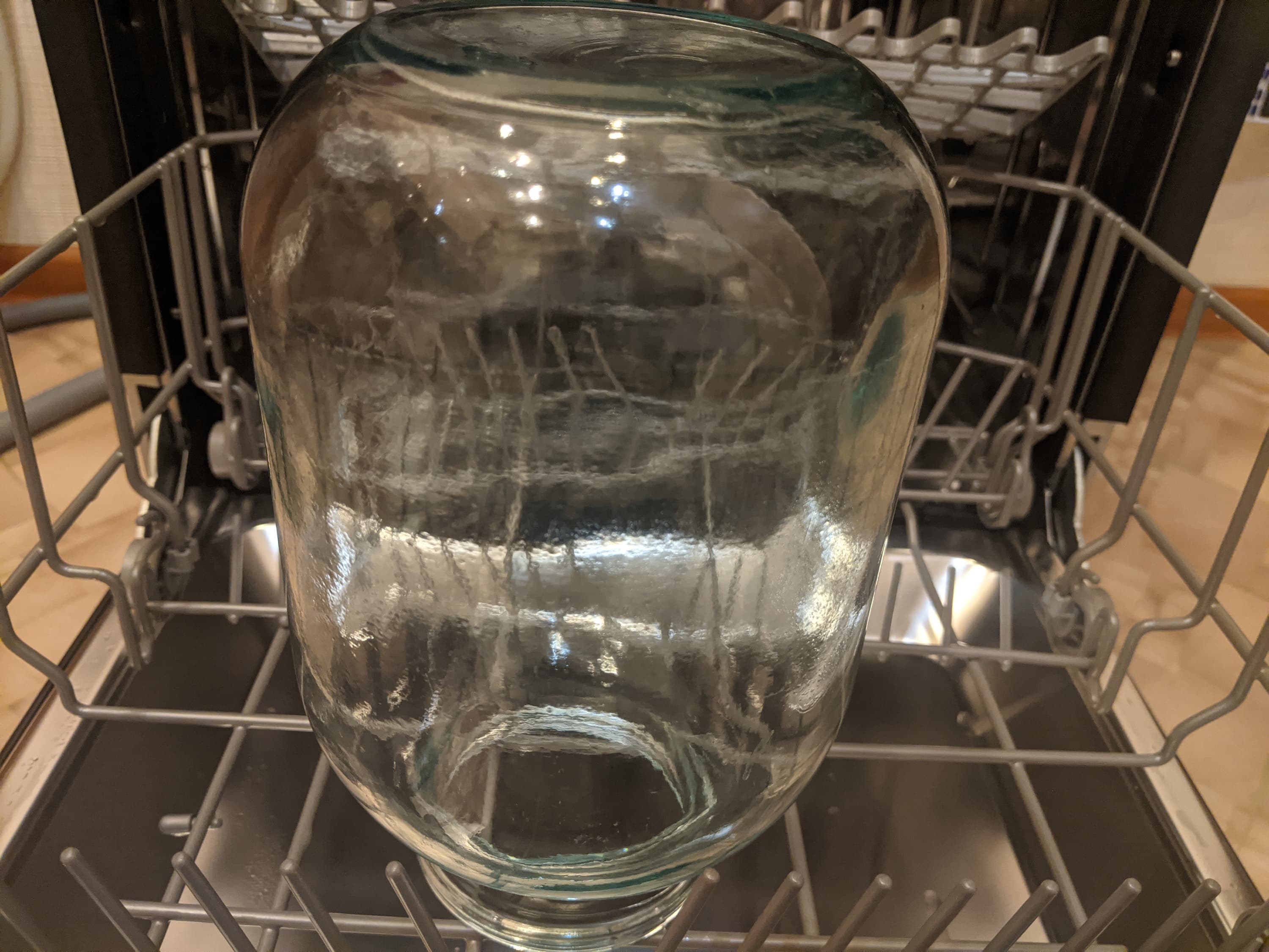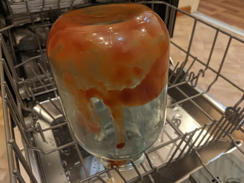 Банку с засохшим томатным соусом поместили в середину нижней корзины и включили программу «Стекло».