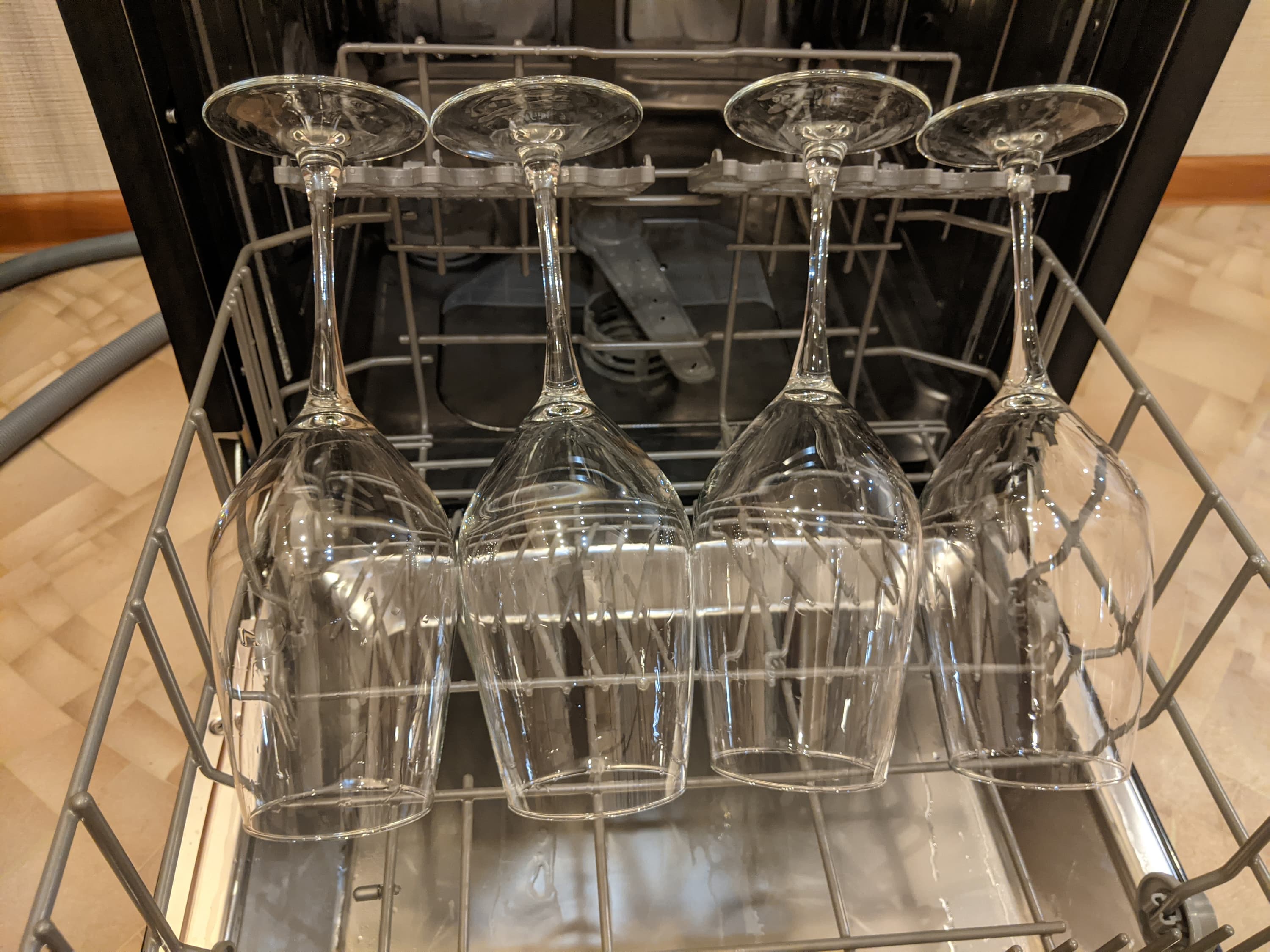 У нижней корзины посудомойки в торце есть две полки с ребристые краями, удобными для того, чтобы опирать на них ножки бокалов. Четыре больших (0,650 л) емкости для красного вина легко разместились в нижней корзине, и мы включили программу «Деликатная».