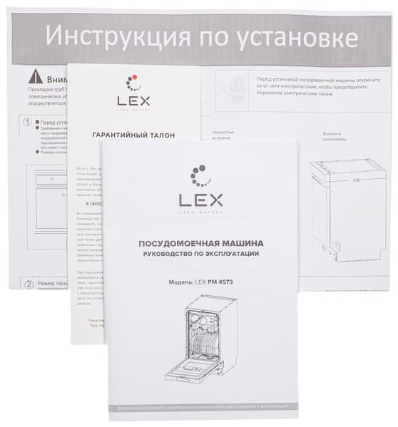 Руководство по эксплуатации посудомоечной машины Lex PM 4573 — это довольно толстая книжечка в белой матовой обложке со схематическим изображением устройства. Бумага достаточно жесткая и плотная, чтобы пережить многократное чтение, шрифт комфортный, однако на некоторых страницах часть текста «съедается» внутренними полями.