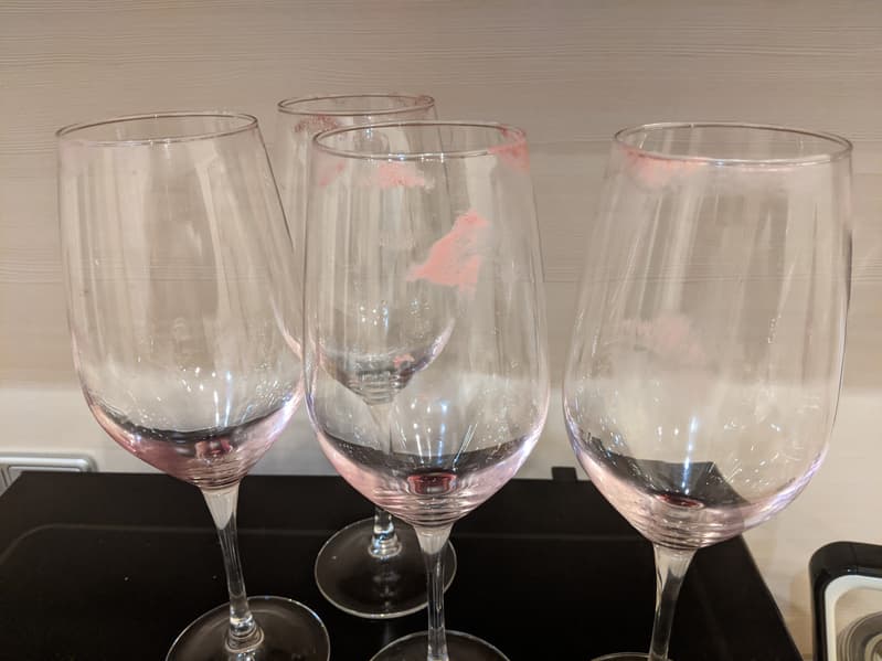 Несколько тонких стеклянных бокалов были обильно испачканы губной помадой и красным вином. Как и в предыдущих тестах, посуду мы оставили высыхать в течение суток.
