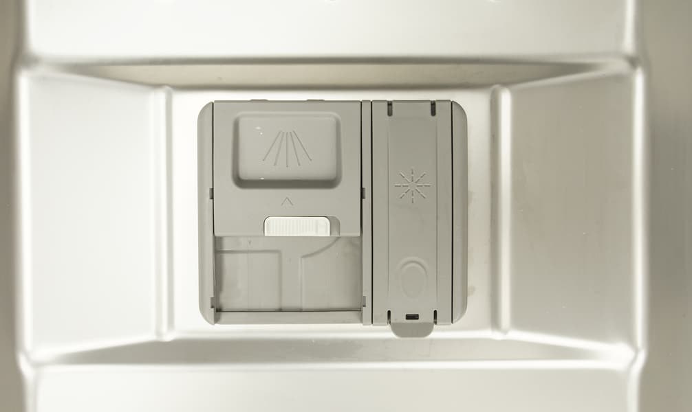 Контейнер состоит из двух частей: большая, со сдвижной заслонкой, предназначена для порошка или таблеток, а в меньшей за откидывающейся крышкой скрывается резервуар для ополаскивателя со встроенным регулятором расхода средства.