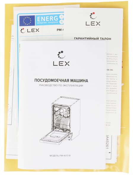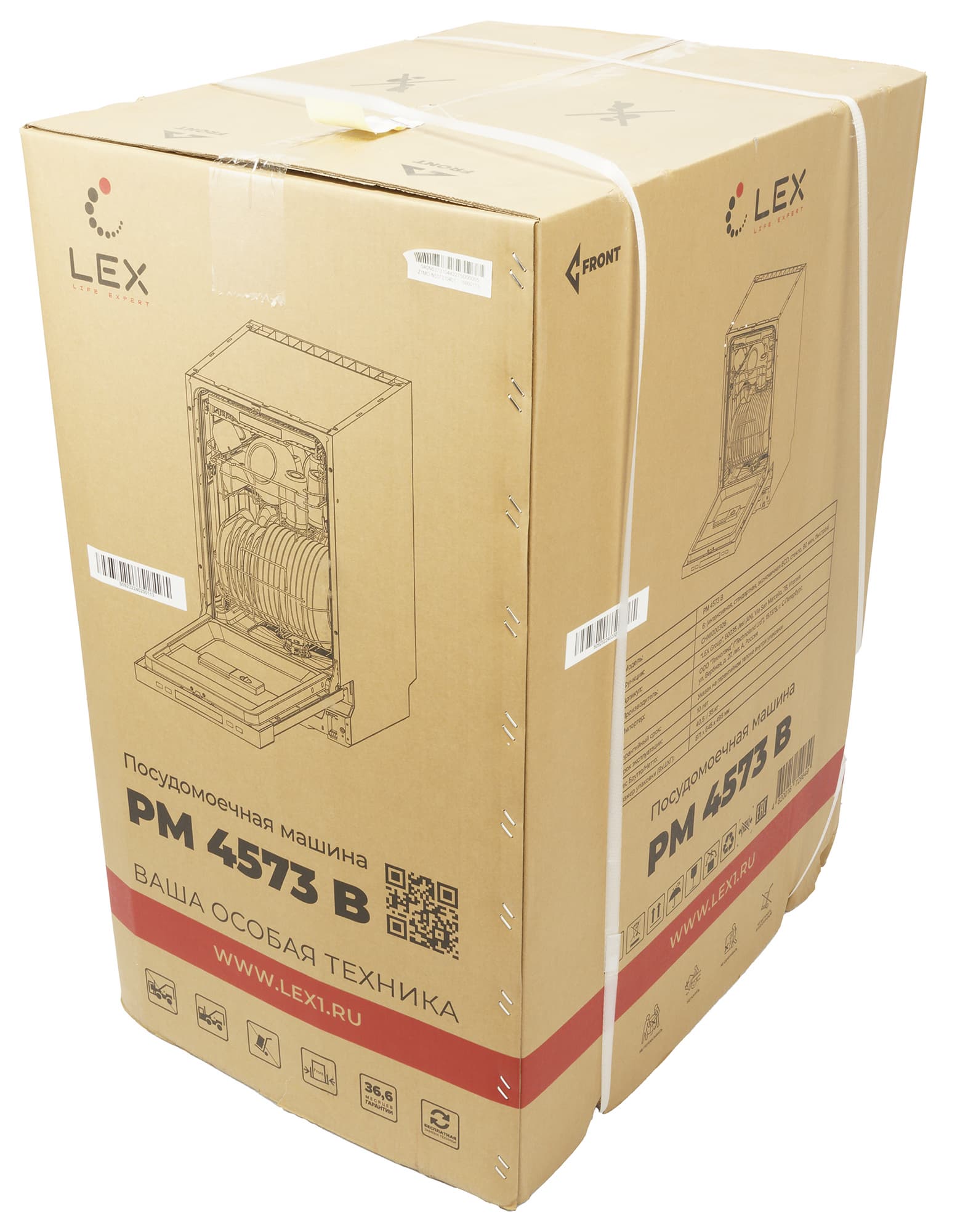 Посудомоечная машина Lex PM 4573 B поставляется в картонной коробке с двухцветной печатью. На гранях упаковки размещены: логотип бренда, полное наименование модели, ее схематические изображения, приведен ряд технических характеристик и транспортировочных значков.