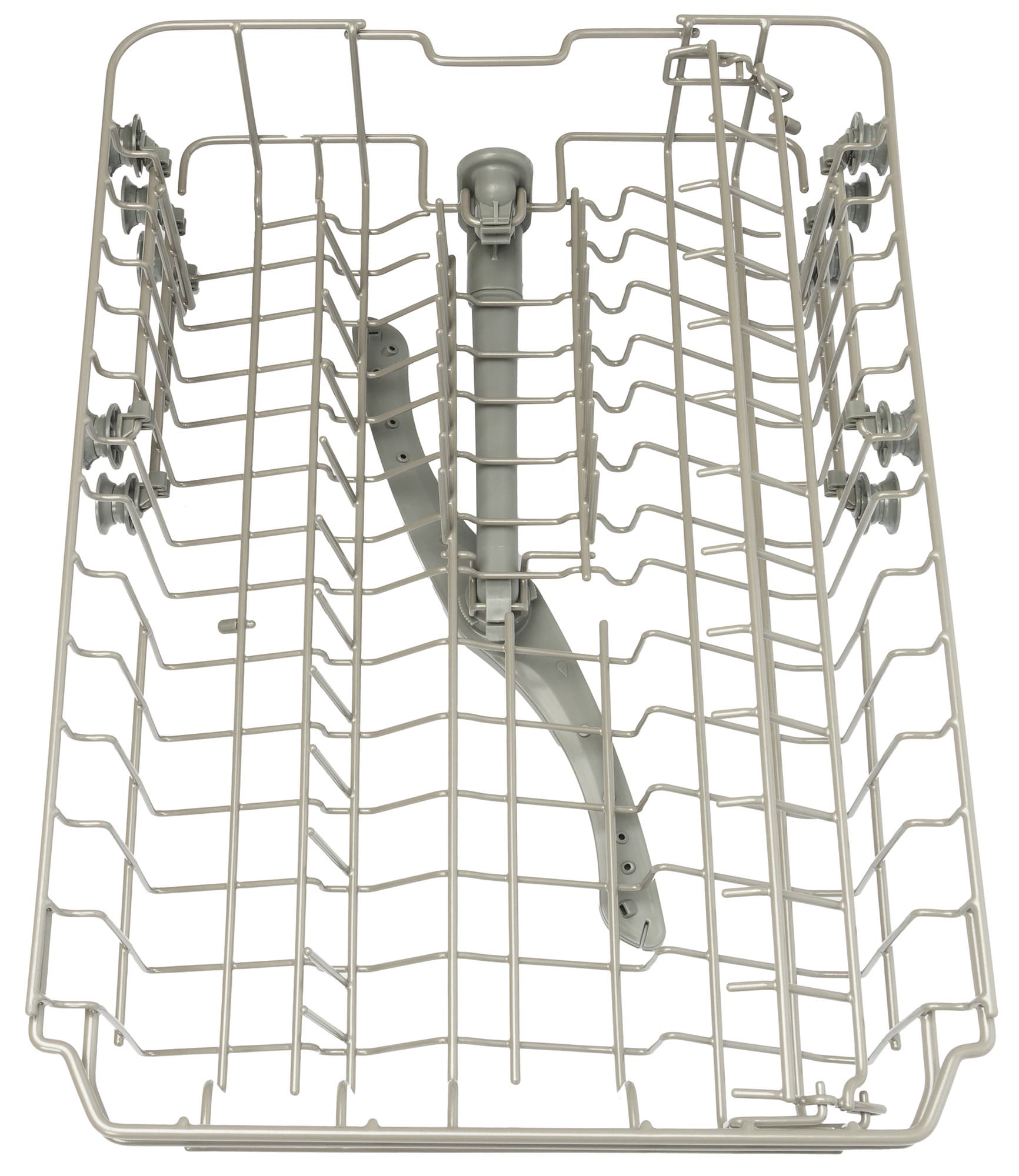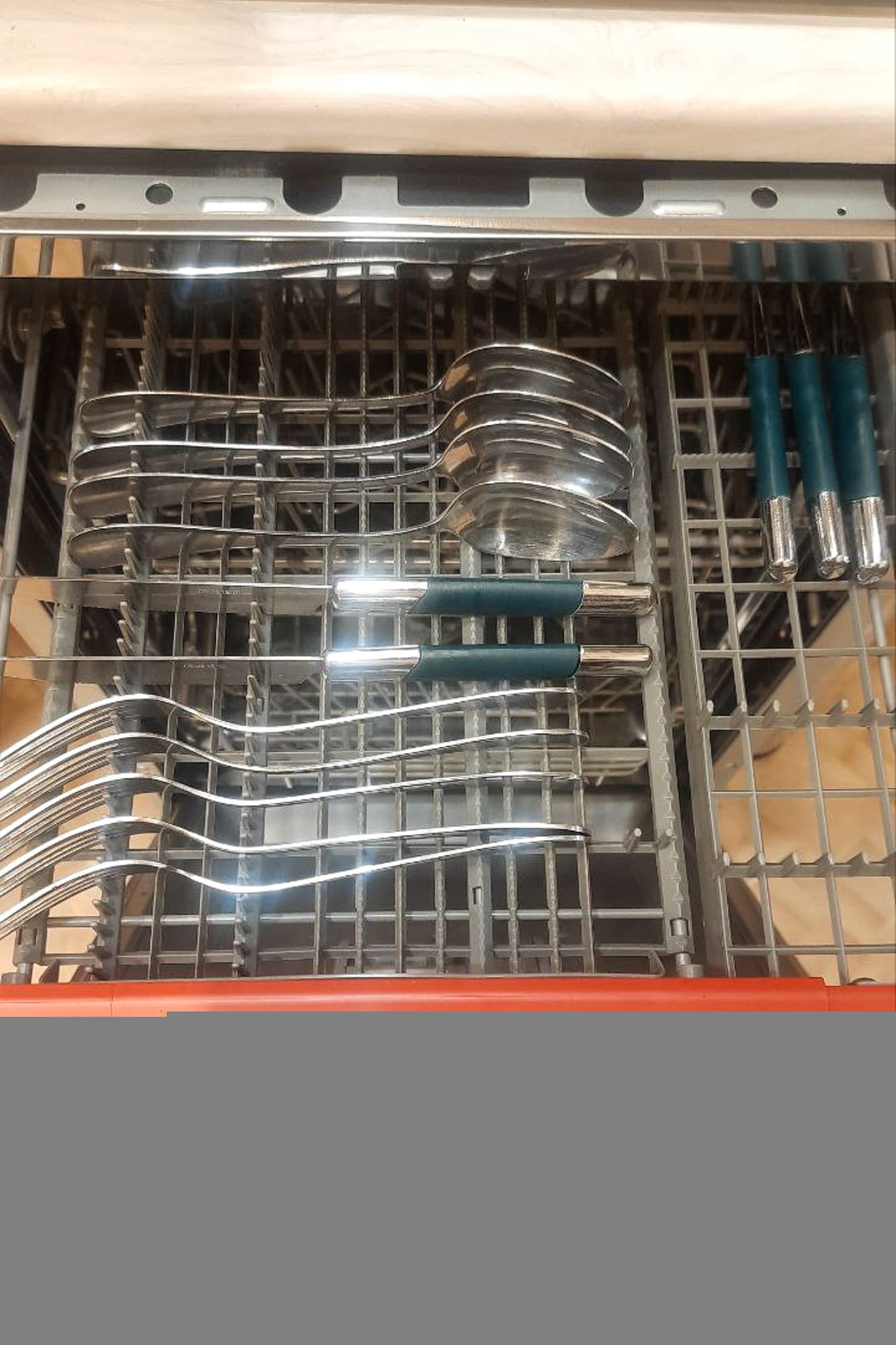 Верхняя корзина для столовых приборов имеет массу разделителей для всевозможных столовых приборов, но крупные предметы типа половника по высоте в нее не войдут.