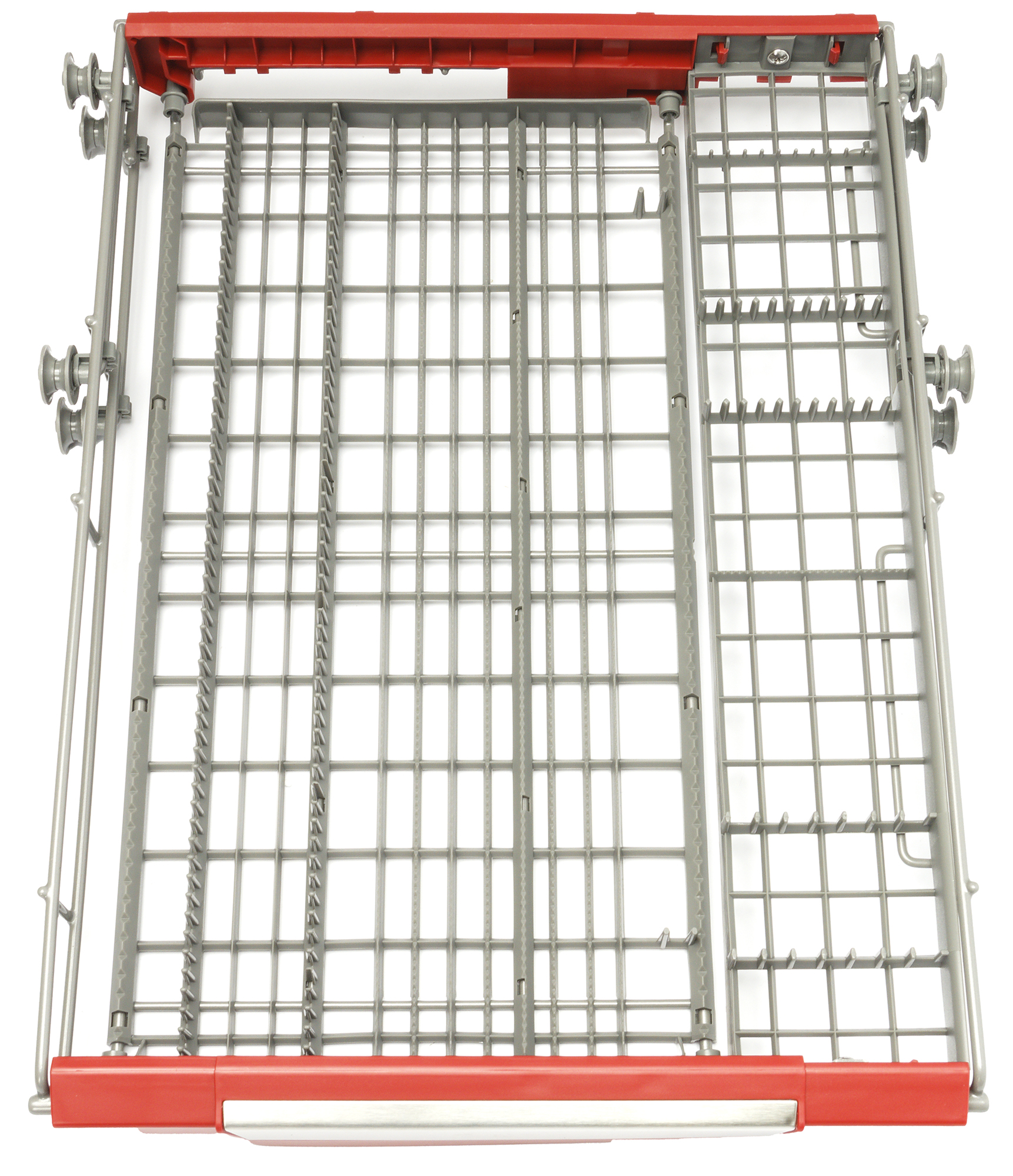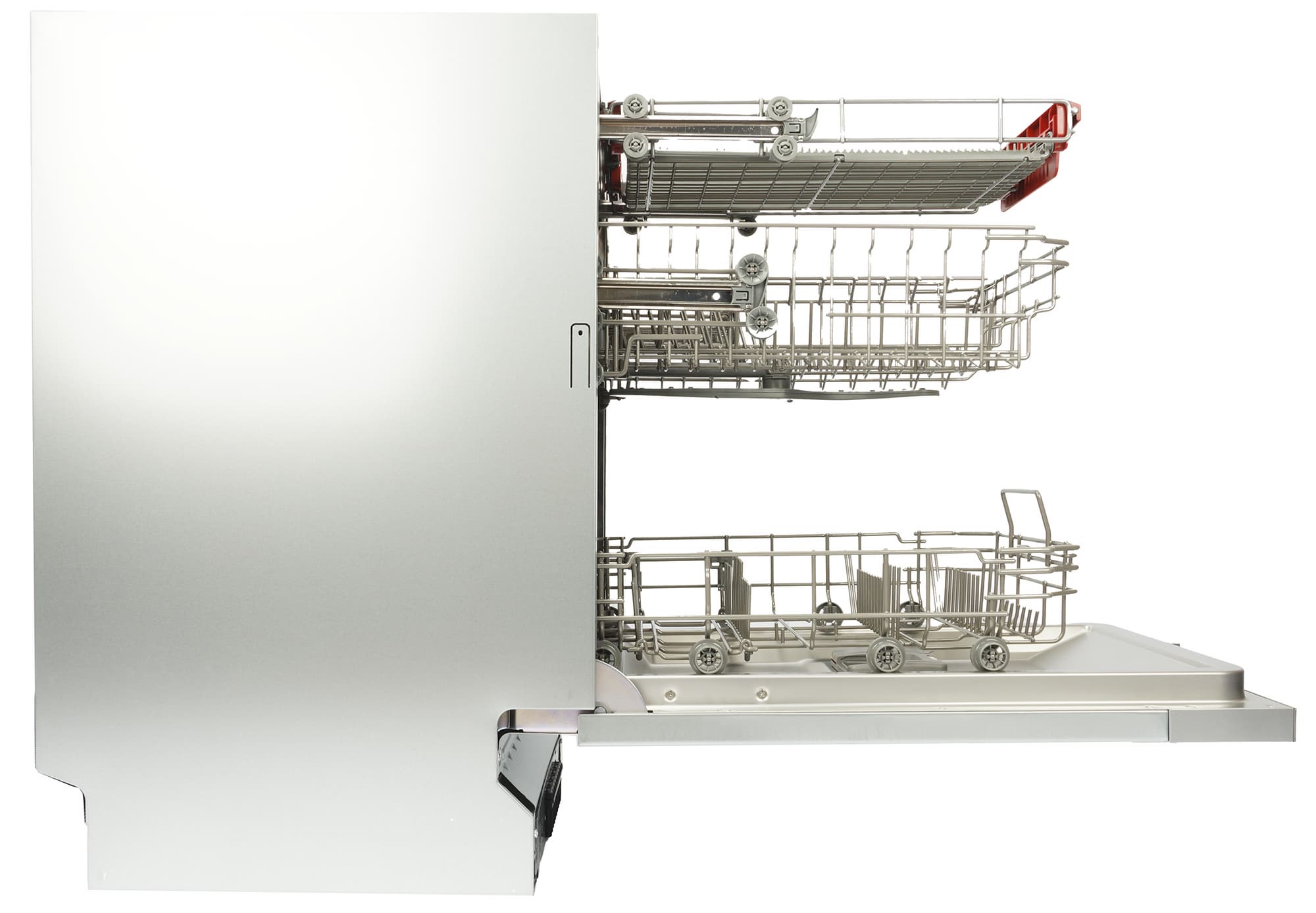 Посуда в этой модели размещается на трех уровнях: нижний предназначен для кастрюль, сковородок и больших тарелок, средний для тарелок поменьше, блюдец, чашек и пиал, наверху на съемной решетке можно разложить столовые приборы, лопатки и ножи. Все три корзины полностью вынимаются.