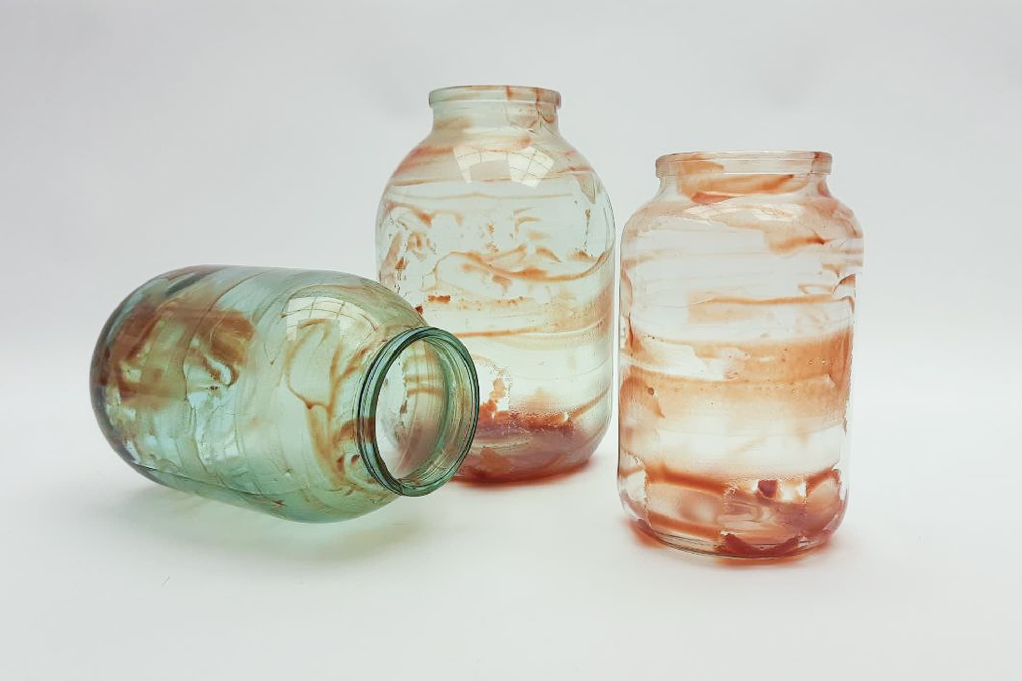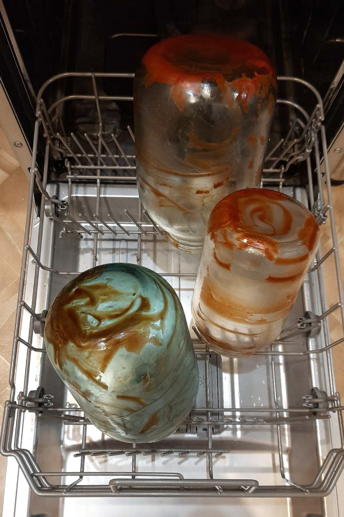 В ход пошел уже знакомый нам кетчуп. Три стеклянные банки разного размера испачкали им изнутри и оставили на сутки подсыхать.
