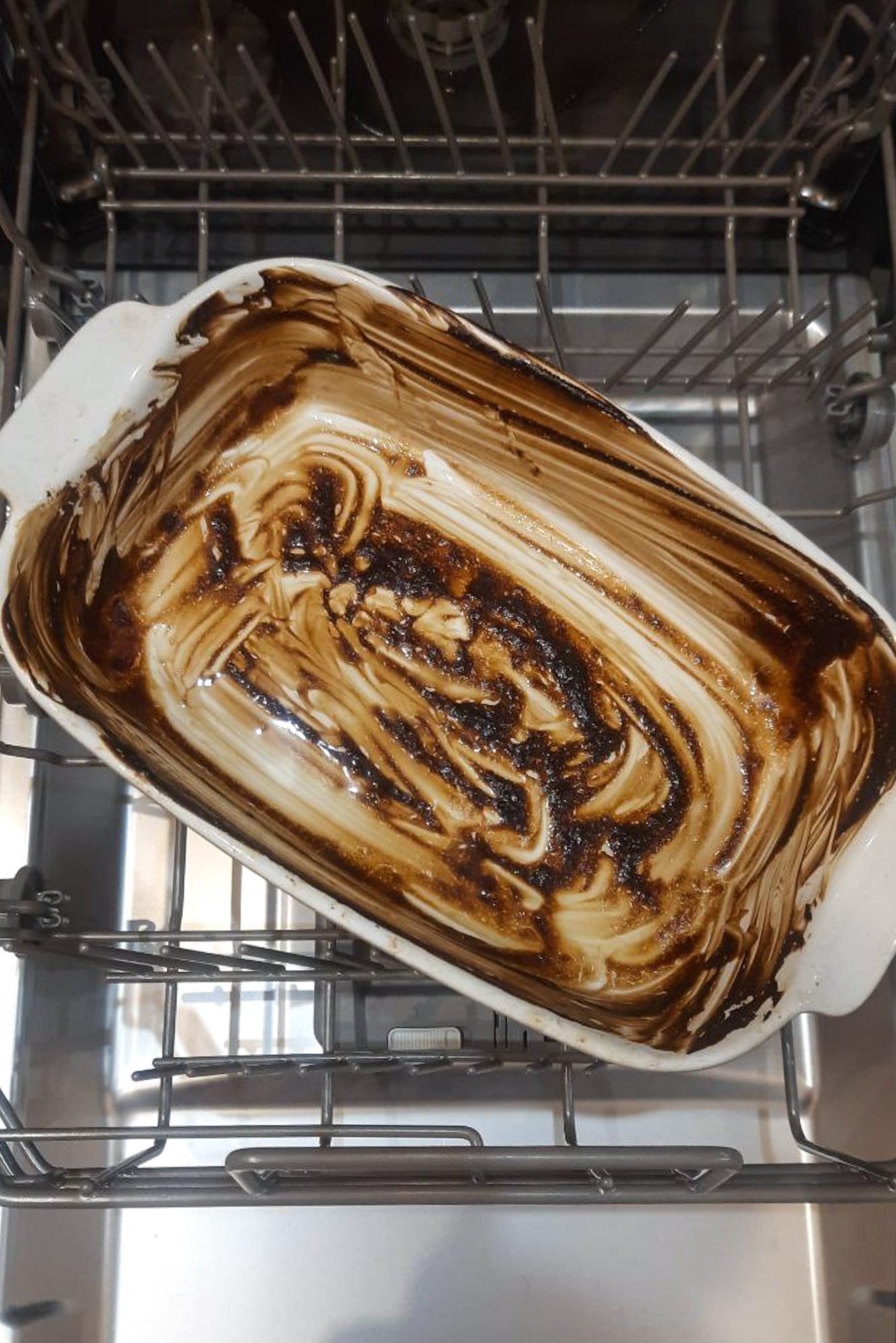 Для теста программы отмывания интенсивных загрязнений мы взяли керамическую форму, в которой запекалось жирное мясо с соусом. После опустошения емкости дополнительно прижарили загрязнения еще в течение 15 минут до стойкой корки и оставили всё это безобразие подсыхать на сутки.