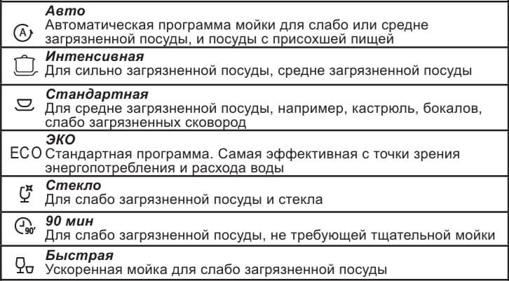 | Количество программ | 7 (нормальный, интенсивный, экономный, стекло, 90 минут, быстрый, автоматическая мойка) |