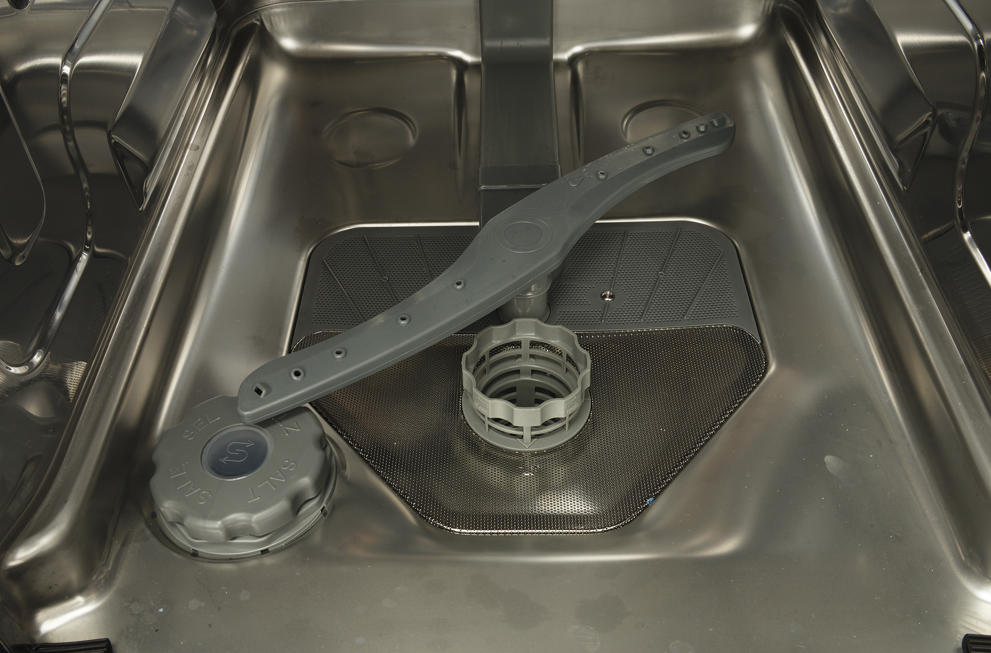 Тут же, на дне бака, под прямоугольной стальной пластиной с мелкой перфорацией находится традиционный фильтр с капроновой сеткой. При необходимости очистки он легко вынимается и промывается. Рядом мы видим отсек для соли с крупной завинчивающейся крышкой.