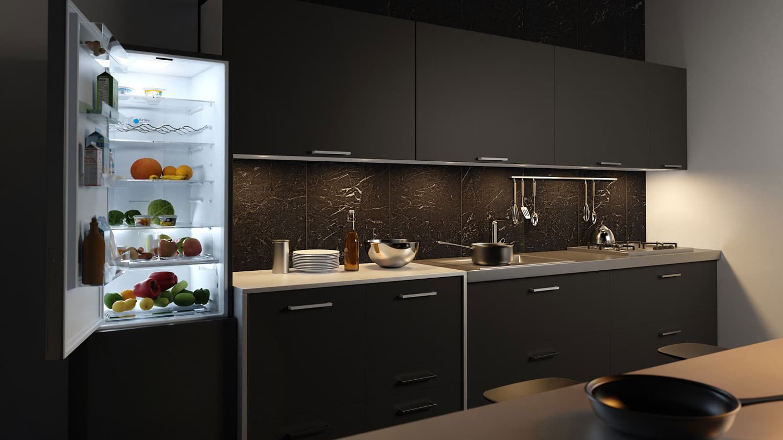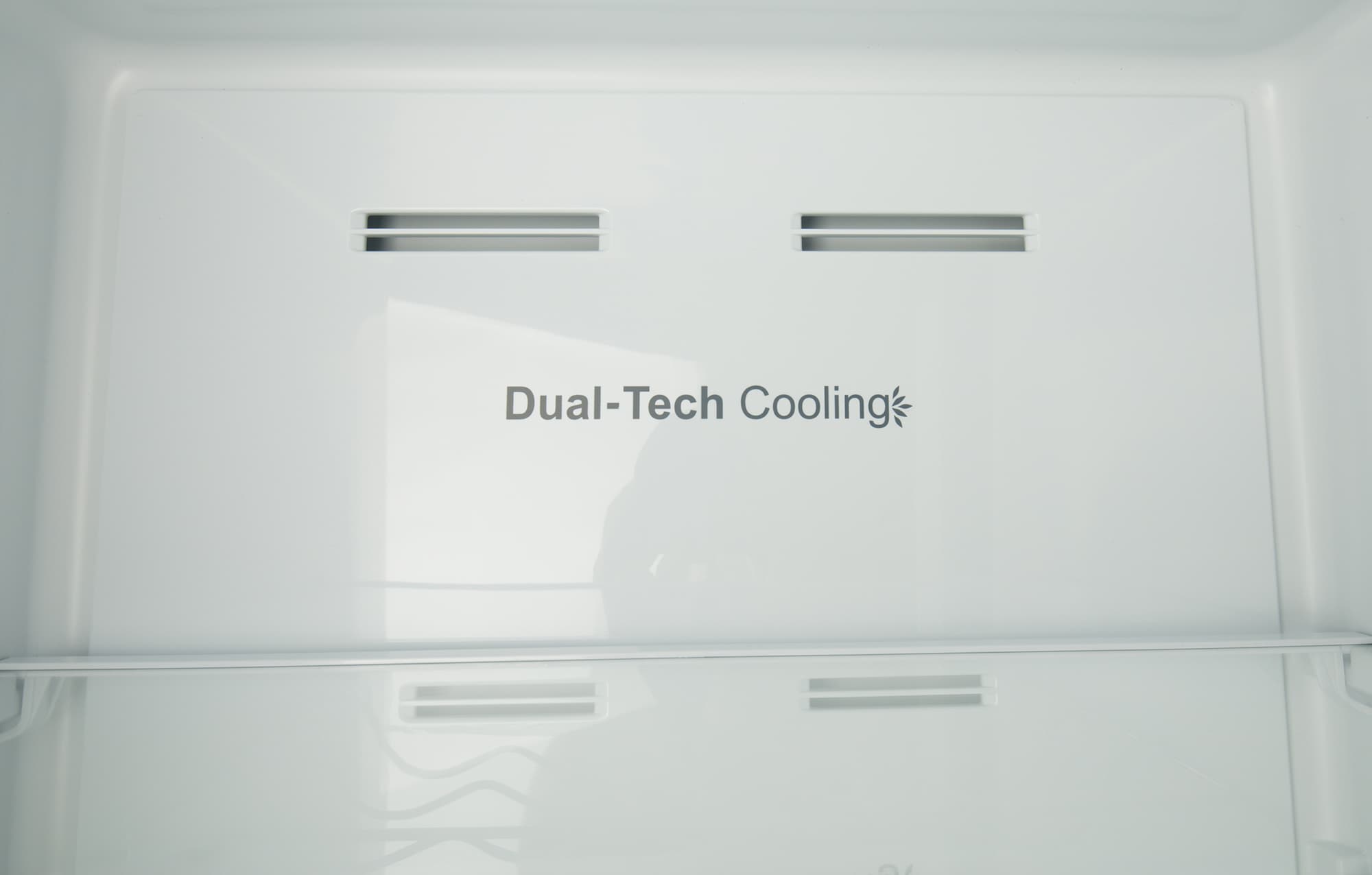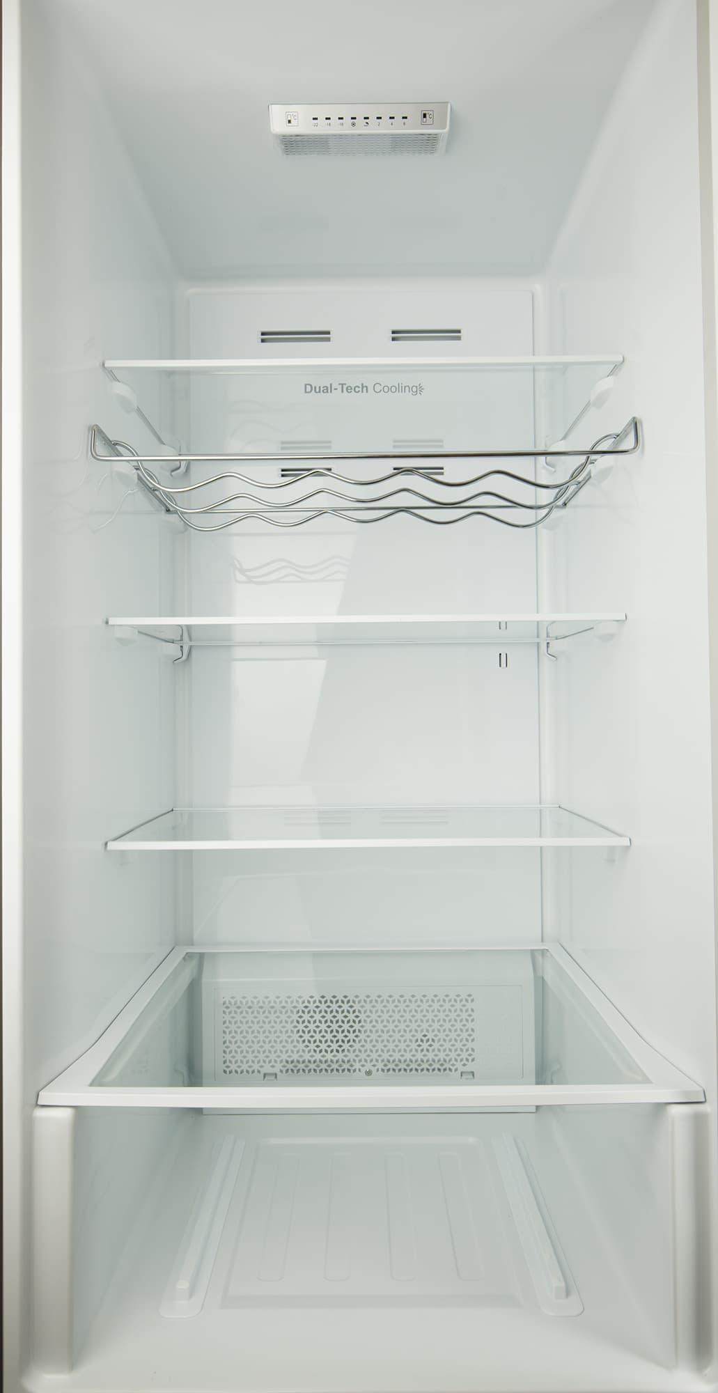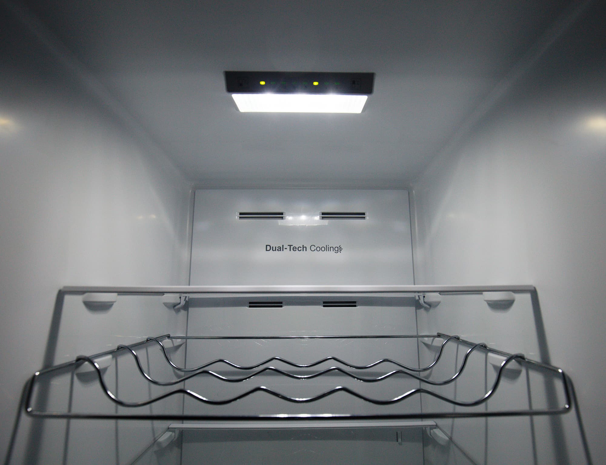 Светодиодная подсветка холодного спектра, размещенная в одном корпусе с управляющим блоком, хорошо освещает все холодильное отделение. Рассекатель направляет свет чуть назад: открытый в темноте холодильник не слепит глаза — это, несомненно, оценят любители есть по ночам.