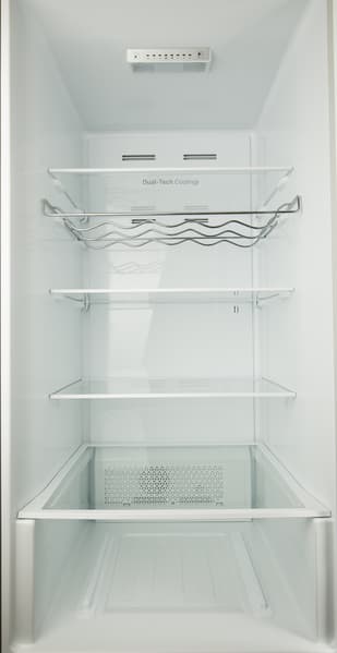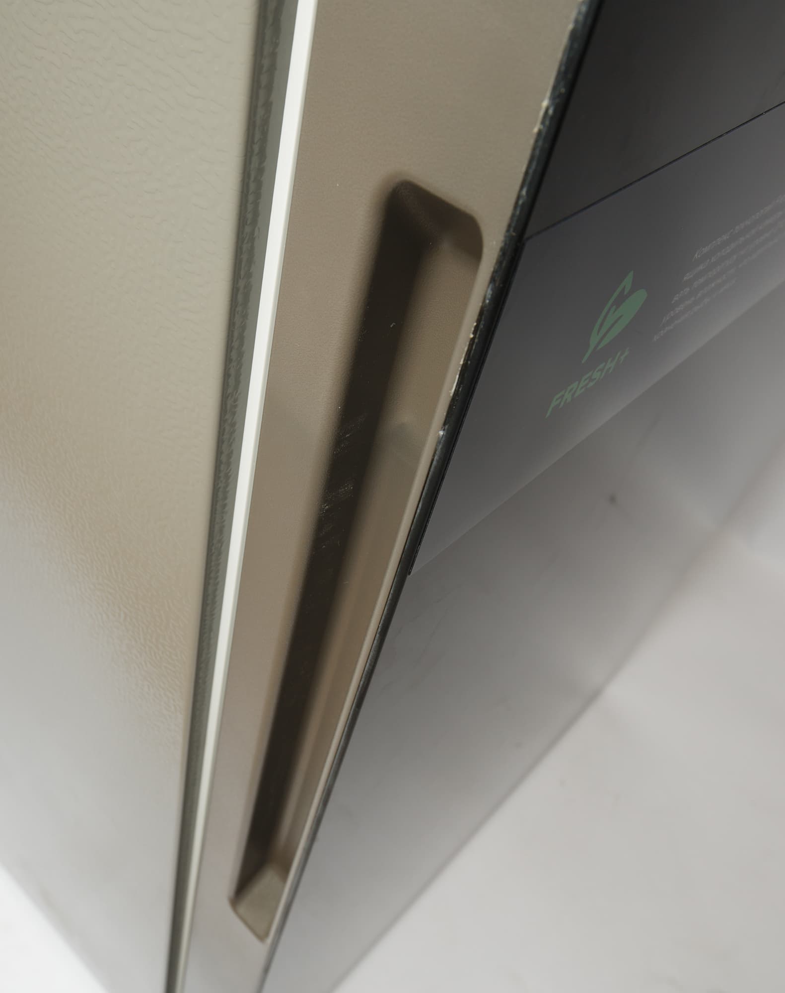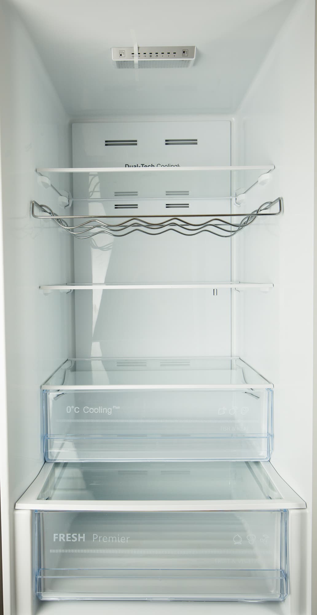 В нижней части — два ящика: один для овощей и фруктов, второй для свежих продуктов. Задвижками, регулирующими температуру и циркуляцию воздуха в зоне свежести, эта модель не оборудована. За задней стенкой овощного отсека находится вентиляционная решетка системы No Frost.