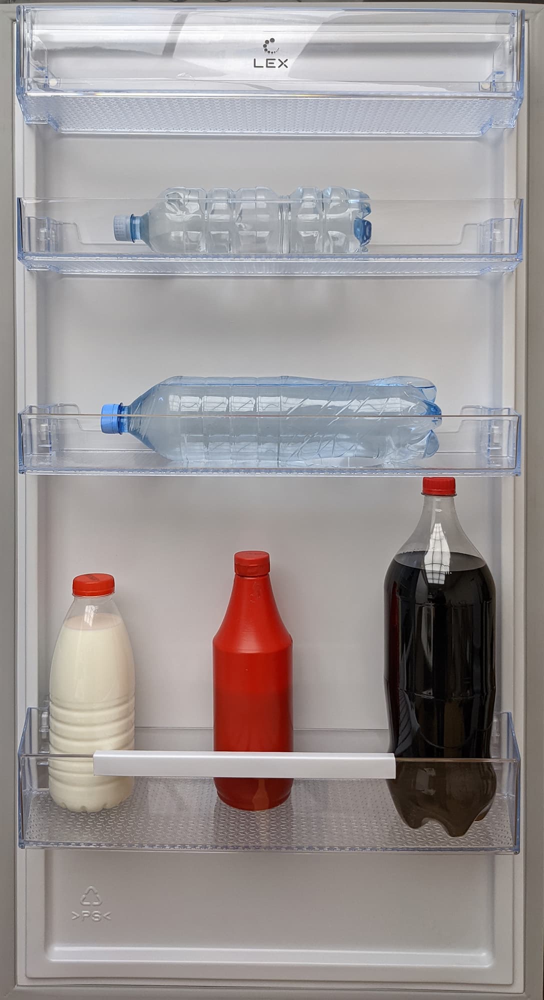 Расположение полок на дверце холодильника также позволяет ставить в нее бутылки до двух литров. Однако полутора- и двухлитровым емкостям в стандартной конфигурации место найдется только на нижней.