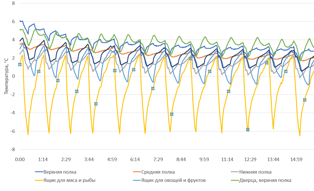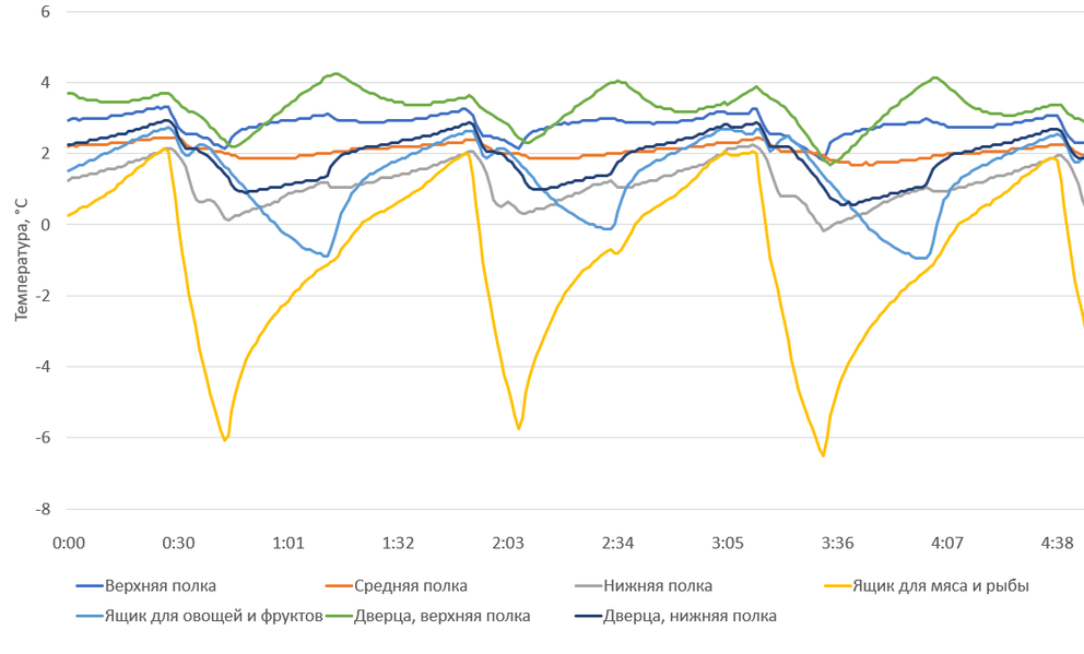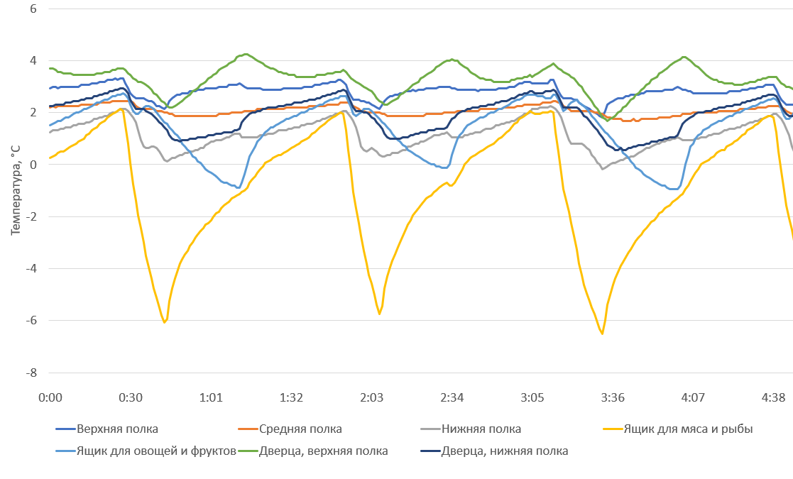 На графике можно видеть, что во всех точках измерения, кроме ящика для овощей, температура колеблется в относительно широких пределах, резко понижаясь при включении компрессора и плавно повышаясь после его отключения. Микроклимат в овощном ящике более ровный: эта зона не вентилируется, поэтому в ней меньше перепадов влажности и температуры. Такой подход позволяет сохранять зелень и фрукты свежими.