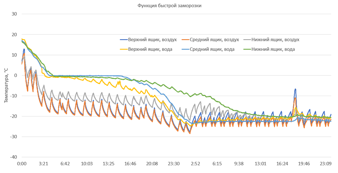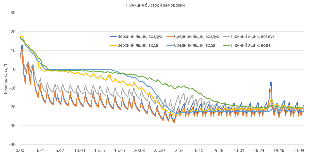 Переход в стадию льда в двух контейнерах из трех был зафиксирован примерно через 16 часов работы, а минимальной температуры лед достиг через 22 часа. По окончании работы в режиме быстрой заморозки температура выровнялась и плавно поднялась до установленных −22 °C.