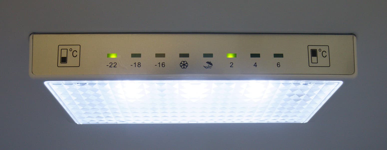В нем всего две сенсорные кнопки. С помощью левой устанавливается температура в морозильном отделении. Последовательно выбираются значения в −16, −18 и −22 °C.
