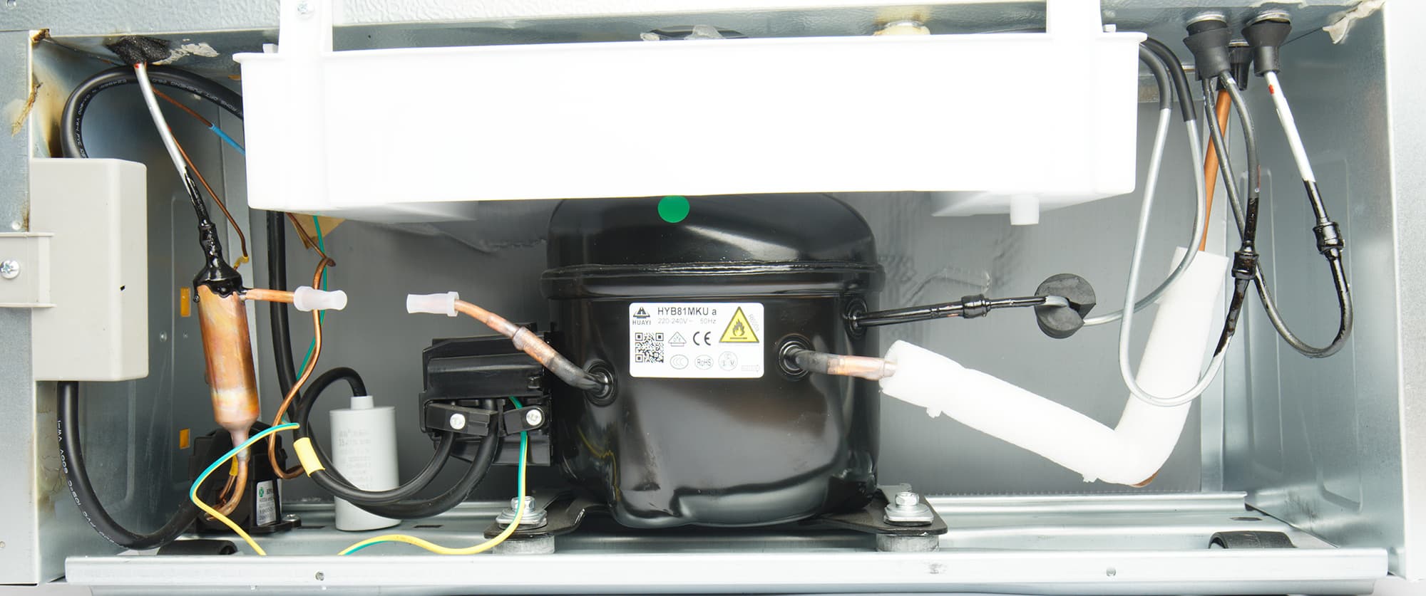 Компрессор HYB81MKU установлен на четырех болтах, которые прикручены к дну и снабжены амортизаторами, гасящими вибрацию. Согласно информации на агрегате, он изготовлен компанией Huayi и заполнен хладагентом R600A. На левой стенке отсека заметны следы сварки.
