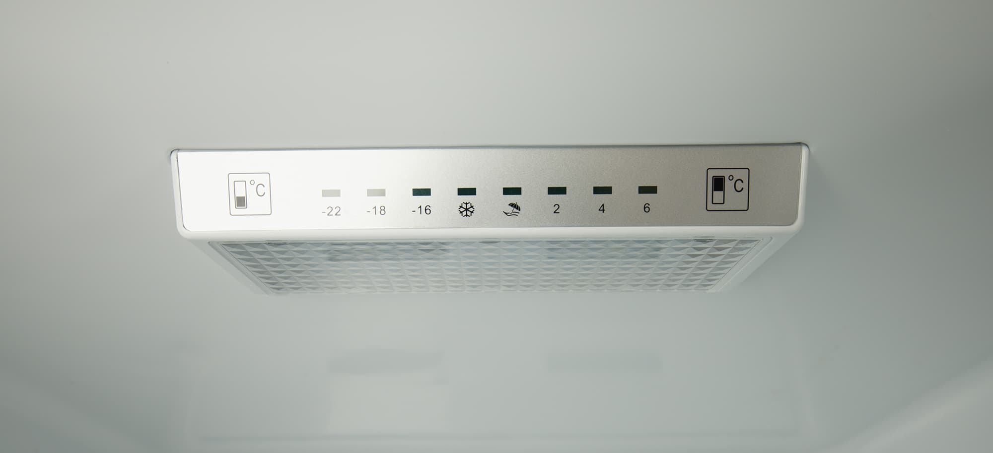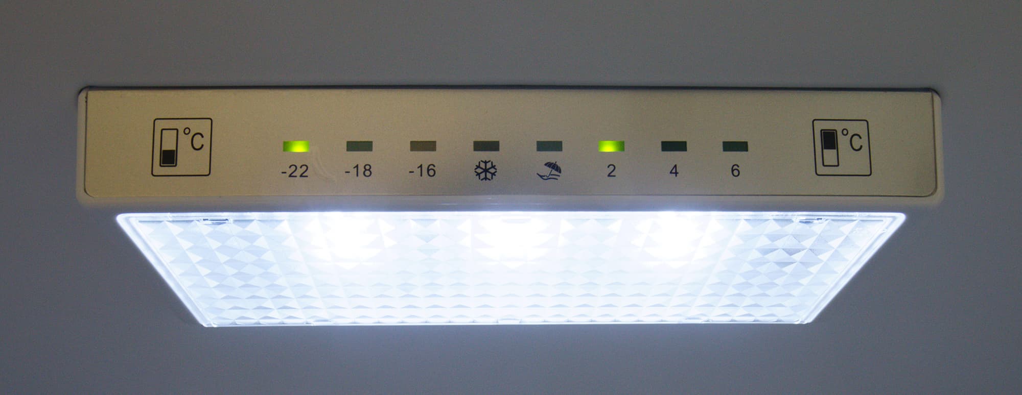 Блок управления холодильником располагается на потолке холодильного отделения и совмещен со светильником.