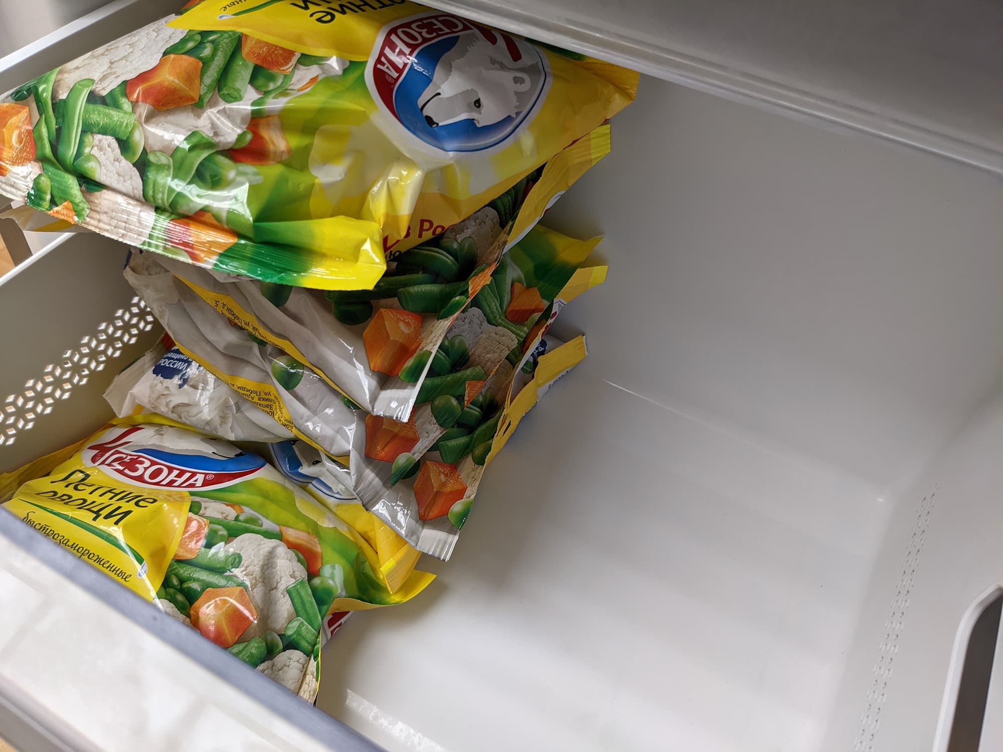 В верхний ящик морозилки можно положить четыре стопки по три овощных пакета — итого двенадцать.