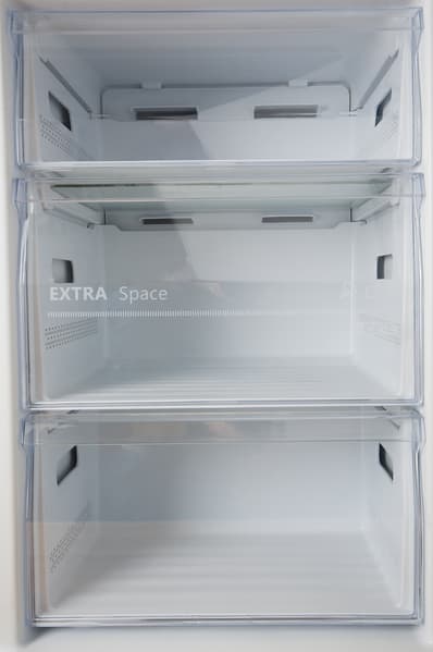 В морозильном отделении три ящика: два одинаковы по высоте, а верхний чуть отличается в меньшую сторону. Глубина самого нижнего ящика чуть меньше, чем у остальных: за ним, как мы помним, располагается отсек холодильного агрегата.