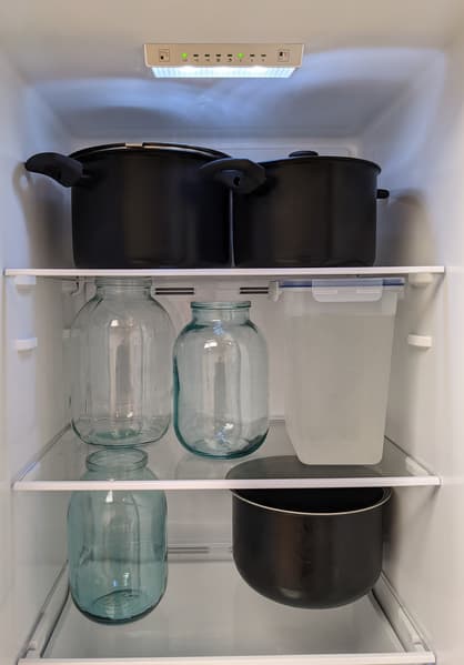 На нижней и верхней полках без проблем размещаются две стандартные кастрюли из Икеи емкостью 5 и 3 литра. Посуда с запасом входит по ширине и высоте, снимать крышки не требуется. Пятилитровая чаша от мультиварки также свободно помещается на любой из полок, кроме средней. Места в холодильнике хватает, чтобы поставить на каждом уровне стеклянные банки емкостью 0,5 и 0,75 л, а вот для литровой и двухлитровой банок подойдут только верхняя и нижняя полки.