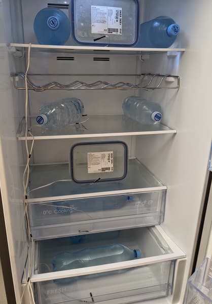 Чтобы имитировать работу загруженного холодильника, для тестирования холодильной камеры мы также использовали водяной балласт в четырехлитровых контейнерах — таких же, как и при испытании морозилки. Кроме того, на полки и дверцу положили несколько пластиковых бутылок с водой.