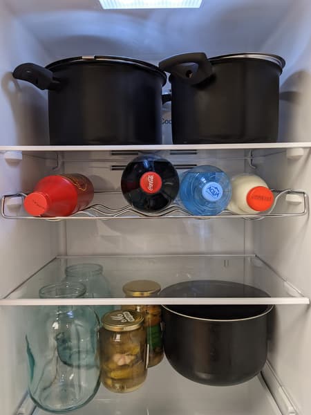 Если надо поставить в холодильник классическую трехлитровую банку с солеными огурцами или стандартный четырехлитровый контейнер из Икеи с капустой, потребуется снять полку для бутылок.