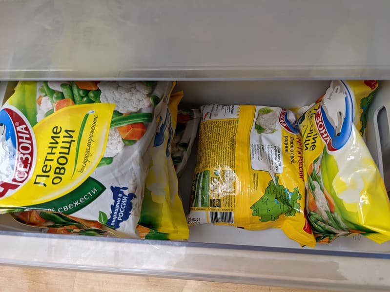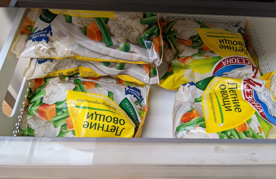 Для демонстрации вместимости морозильного отделения мы традиционно используем стандартные 400-граммовые пакеты с замороженными овощами.