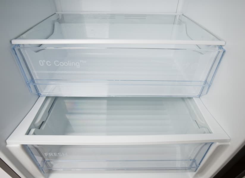 У «овощного» и «мясного» ящиков полупрозрачные передние панели из голубоватого пластика. Легкое затемнение не мешает видеть содержимое контейнеров.
