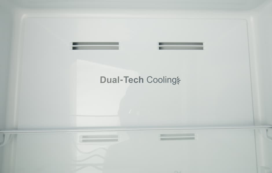 Две трети задней стенки морозилки занимает пластиковая фальшпанель, распределяющая поток холода. Помимо вентиляционного отверстия, через которое воздух попадает в нижний ящик, на перегородке есть еще четыре. Контуры охлаждения холодильного и морозильного отделений независимы друг от друга. В Lex это называют технологией Double Cooling, но, в общем, всем нам понятно, что имеется в виду: один компрессор попеременно работает на охлаждение одного из двух отделений.