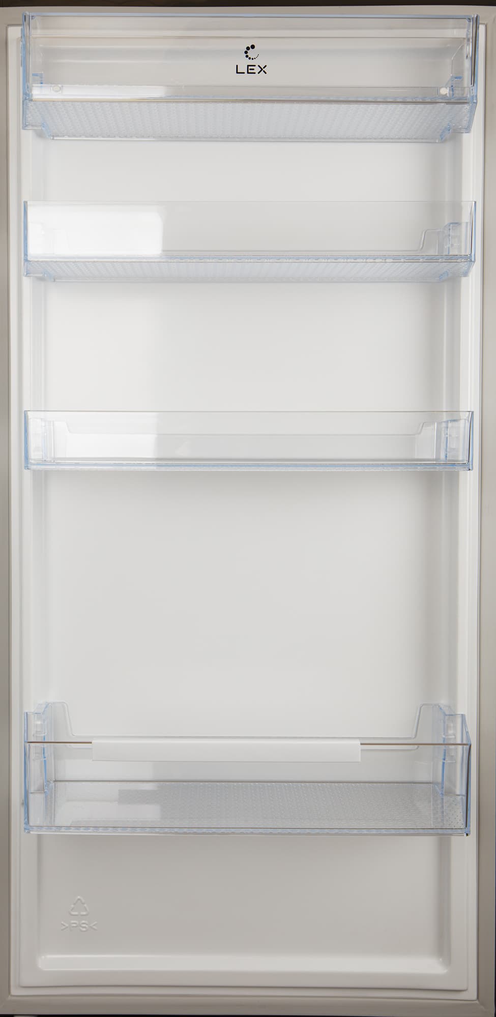 Лицевые панели обеих дверец Lex RFS 204 NF Black из черного стекла. Они ничем не украшены, кроме рекламных наклеек: на корпусе нет даже привычного логотипа производителя. Единственное указание на то, что прибор изготовлен под маркой Lex, мы обнаружили только внутри холодильной камеры, но об этом — чуть ниже.