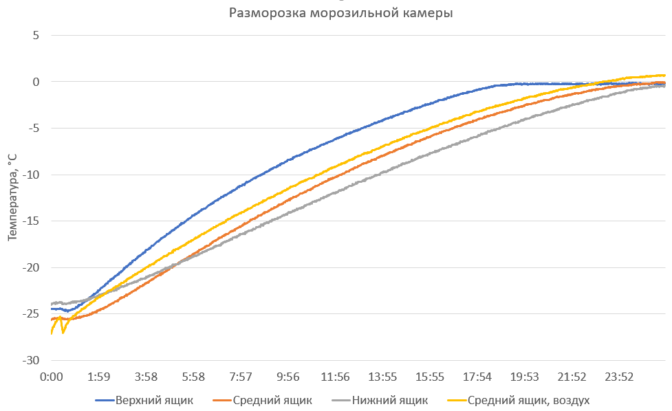 Первые сутки компрессор холодильника работал в усиленном режиме, а потом перешел на обычный. Можно видеть, что до нуля градусов вода в контейнерах охладилась приблизительно за четыре часа.