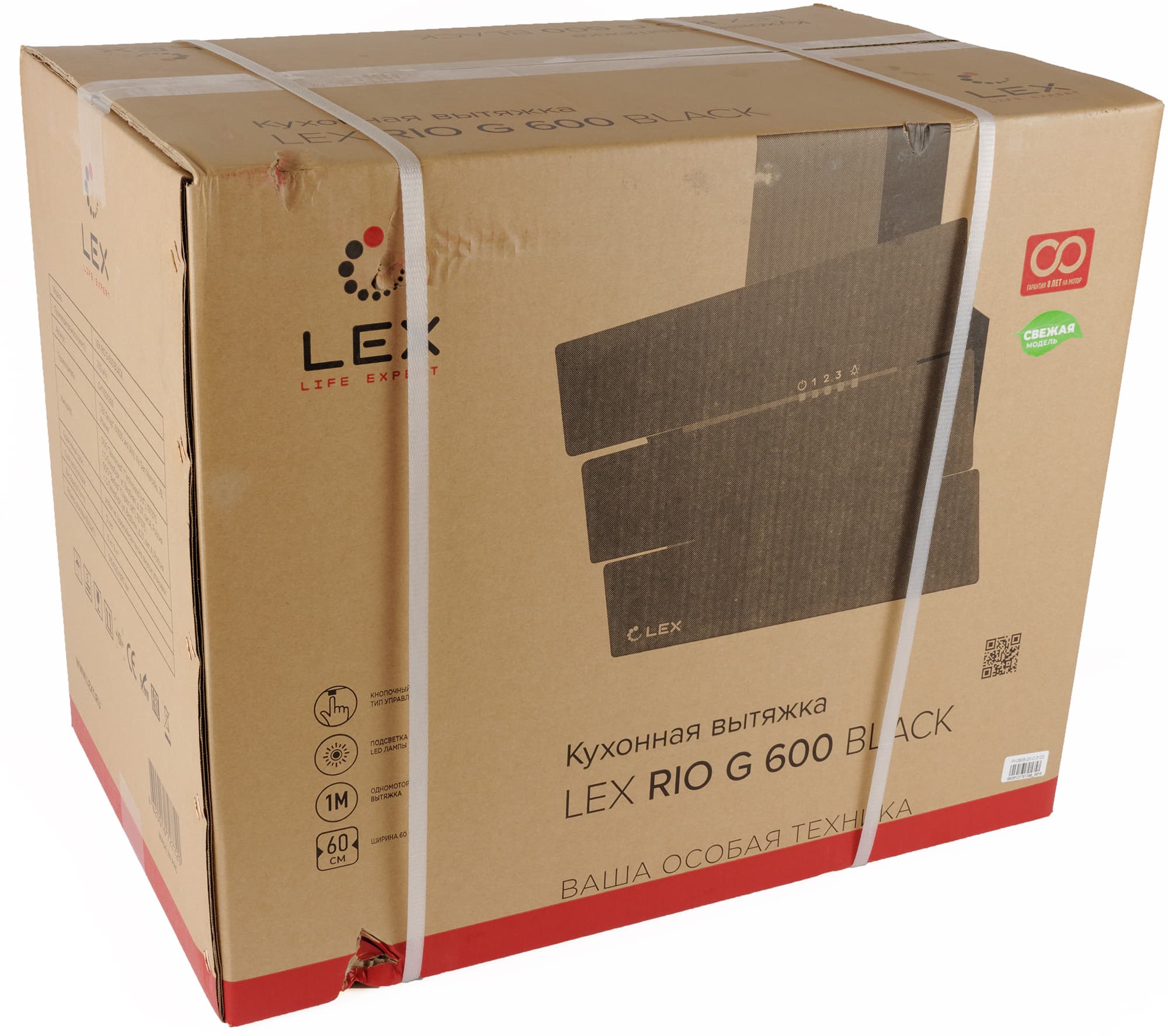 Вытяжка приехала в тестовую лабораторию в коричневой картонной коробке с двухцветной печатью. На лицевой стороне изображен сам прибор, там же — название модели, логотип компании и главные особенности Rio G 600: это одномоторная вытяжка шириной 60 сантиметров с кнопочным управлением и светодиодной подсветкой.