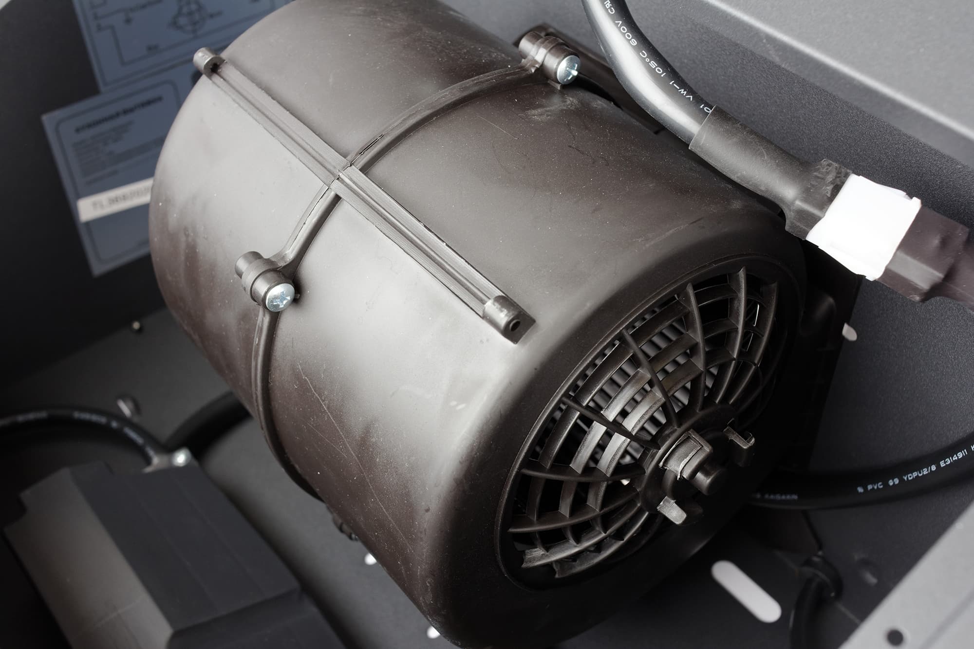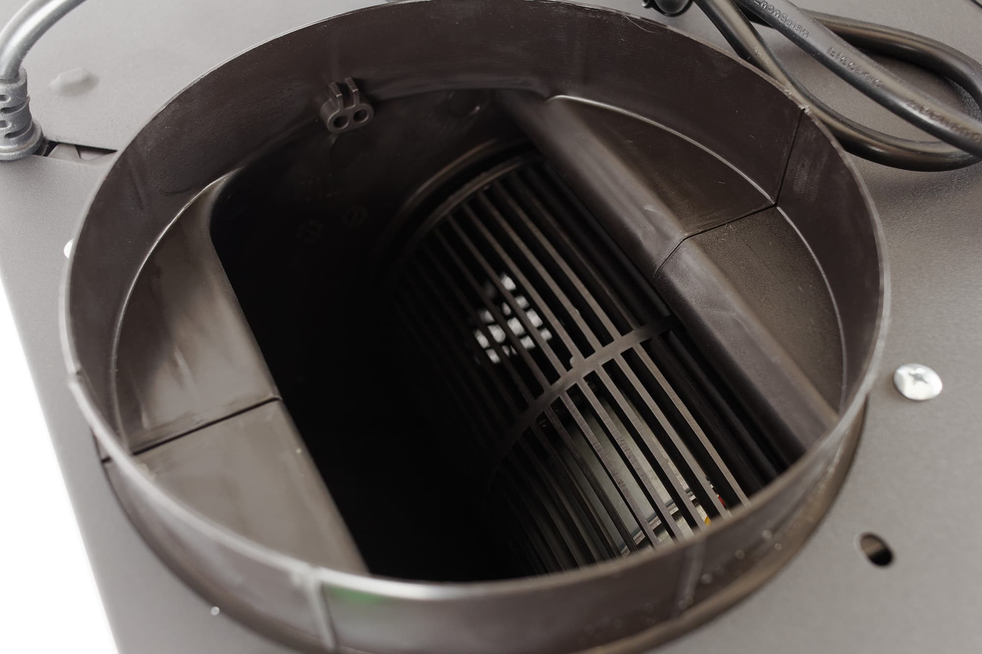 За решеткой фильтра располагается вентилятор в цилиндрическом корпусе из пластика. При использовании Rio G 600 как отдельно стоящей вытяжки, без подключения к вытяжной вентиляции, на выходное отверстие устанавливается сменный угольный фильтр, который поглощает запахи кухни (при необходимости его можно купить отдельно).