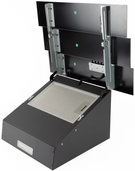 Декоративный короб, призванный скрывать вентиляционный канал, выкрашен в тот же радикально черный цвет, что и вытяжка. Он состоит из двух частей, вставляющихся одна в другую и позволяющих регулировать высоту установки в широких пределах. На боковых сторонах верхней половины находятся вентиляционные решетки, а нижняя украшена логотипом производителя.