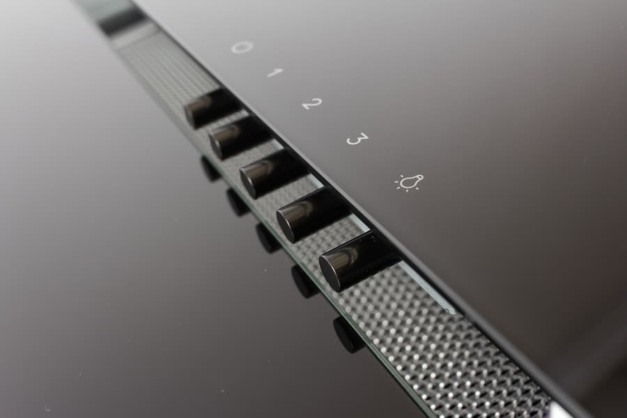 На нижнюю панель нанесен логотип производителя, между средней и верхней располагается кнопочный блок управления. Никаких других украшений у вытяжки нет: ее дизайн строг, современен и необычен.