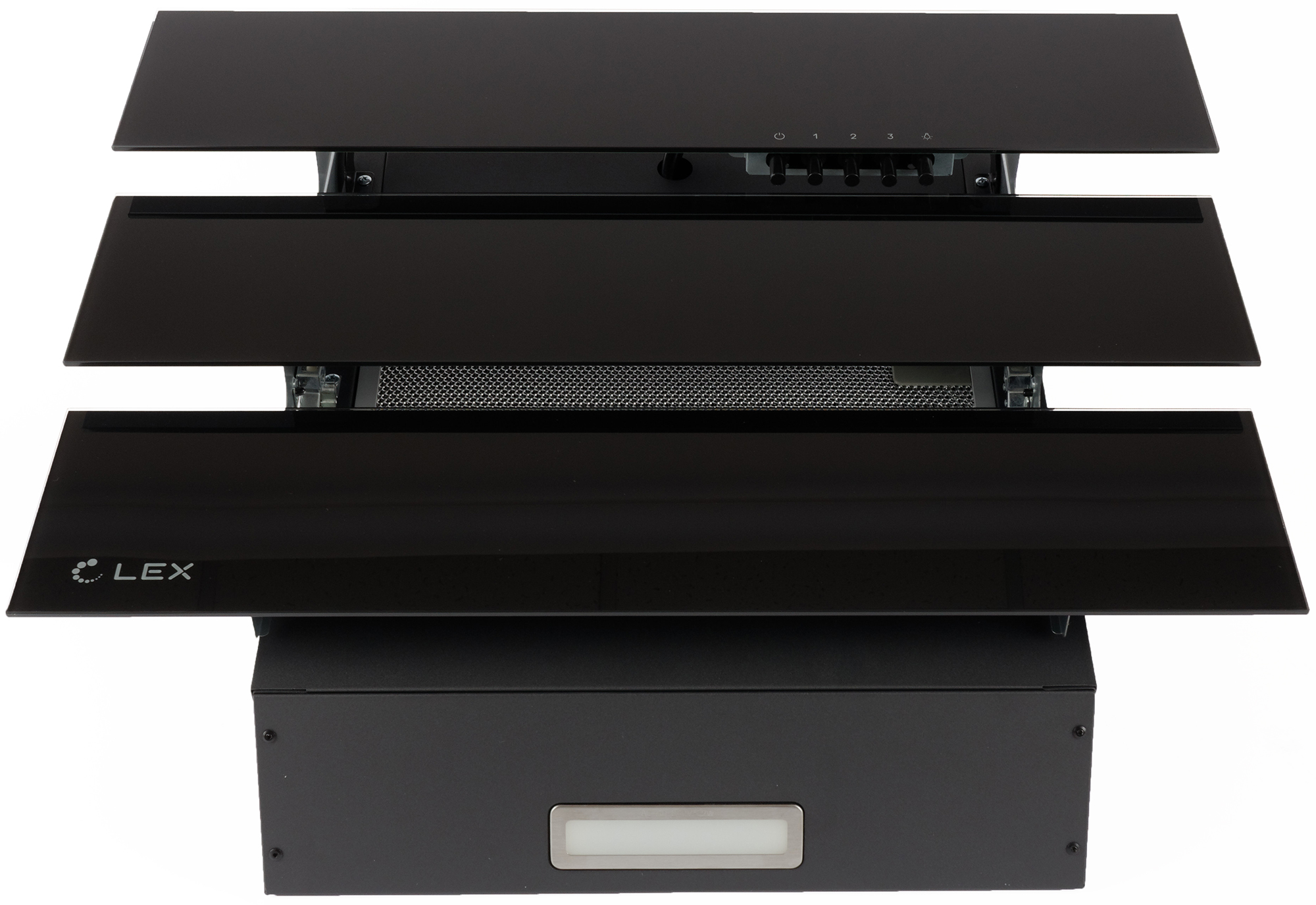 Lex Rio G 600 — наклонная вытяжка необычной конструкции. Стеклянная панель, под которой скрывается фильтр, не цельная, как это чаще всего бывает у подобных моделей, а разделенная на три прямоугольных полосы, расположенные уступом.