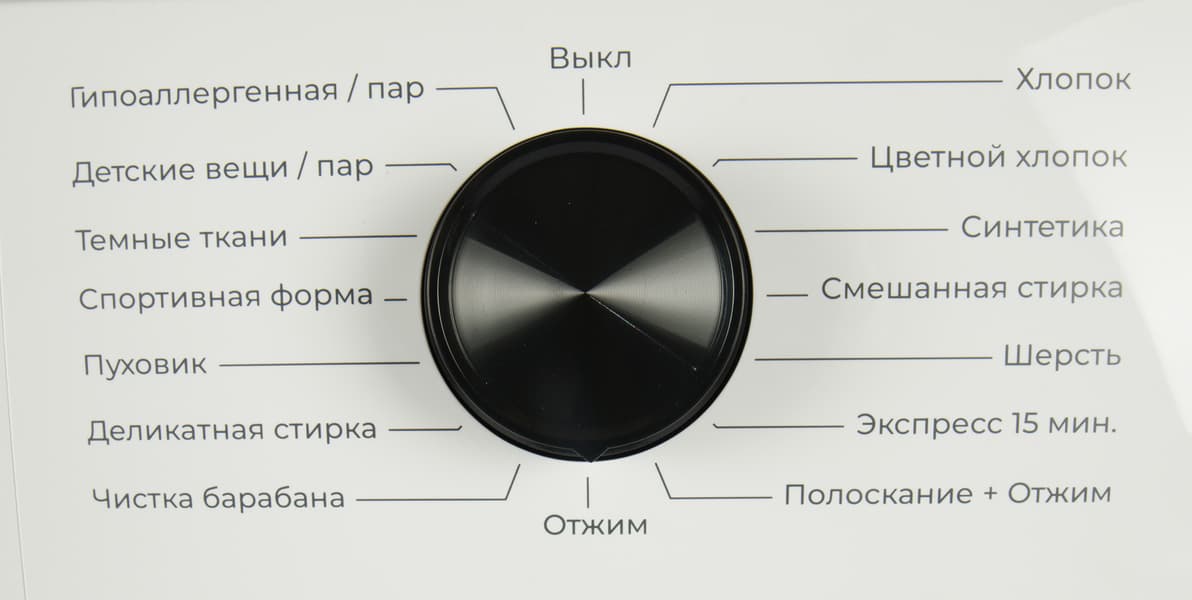 Шайба селектора, размещенная в центре панели управления, служит для выбора основных программ стирки. Риска на цилиндре указывает на выбранный сценарий, а вертикальное положение метки выключает прибор.